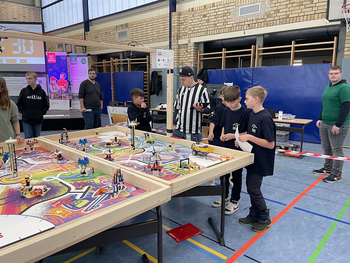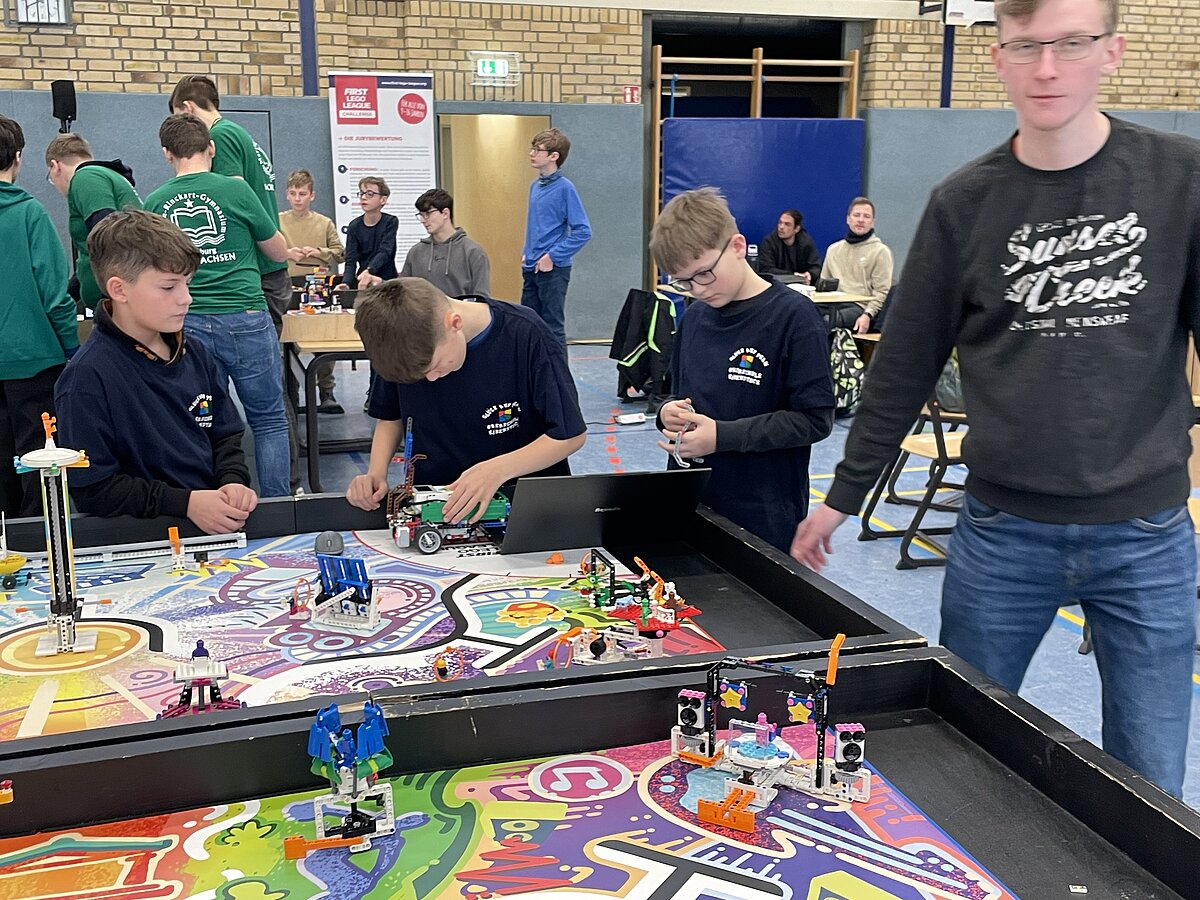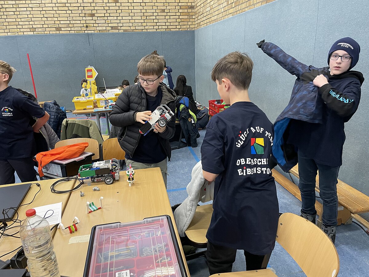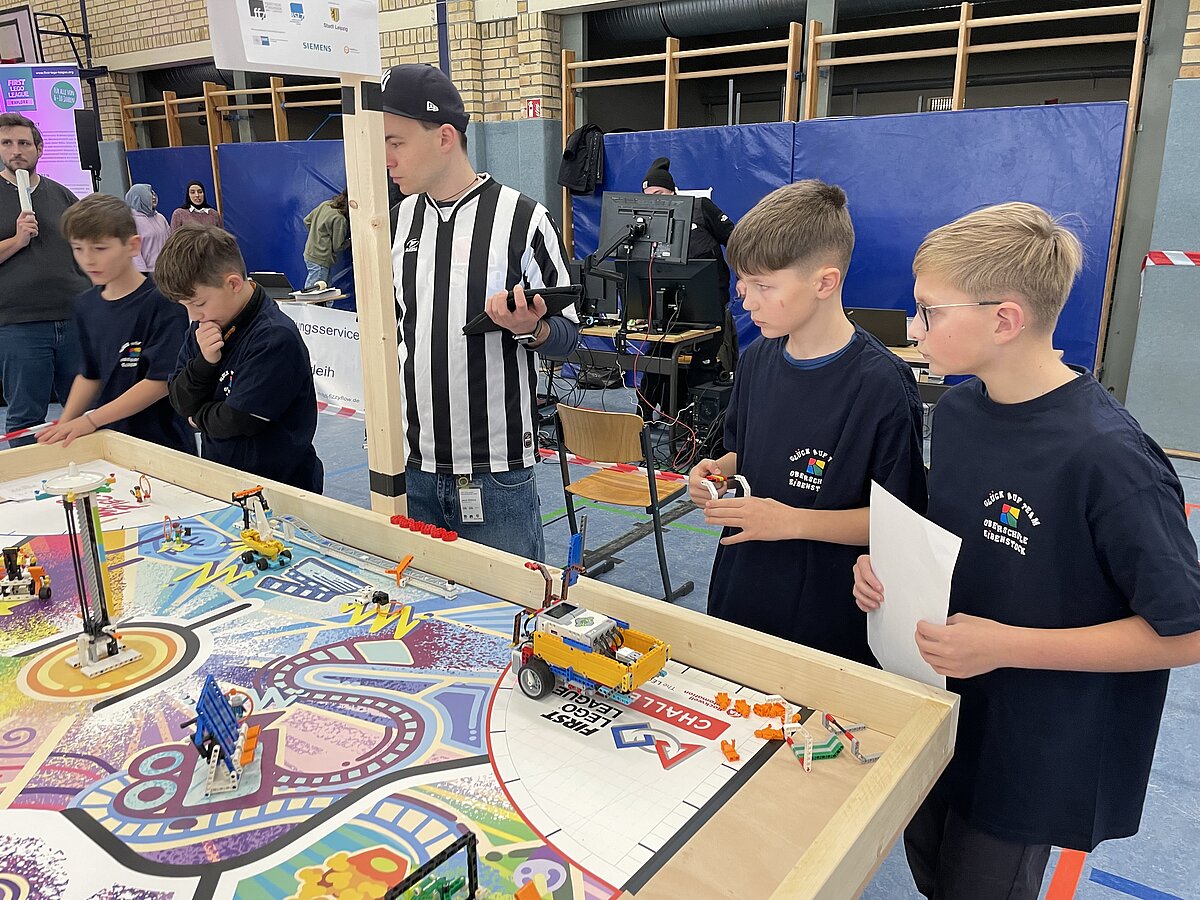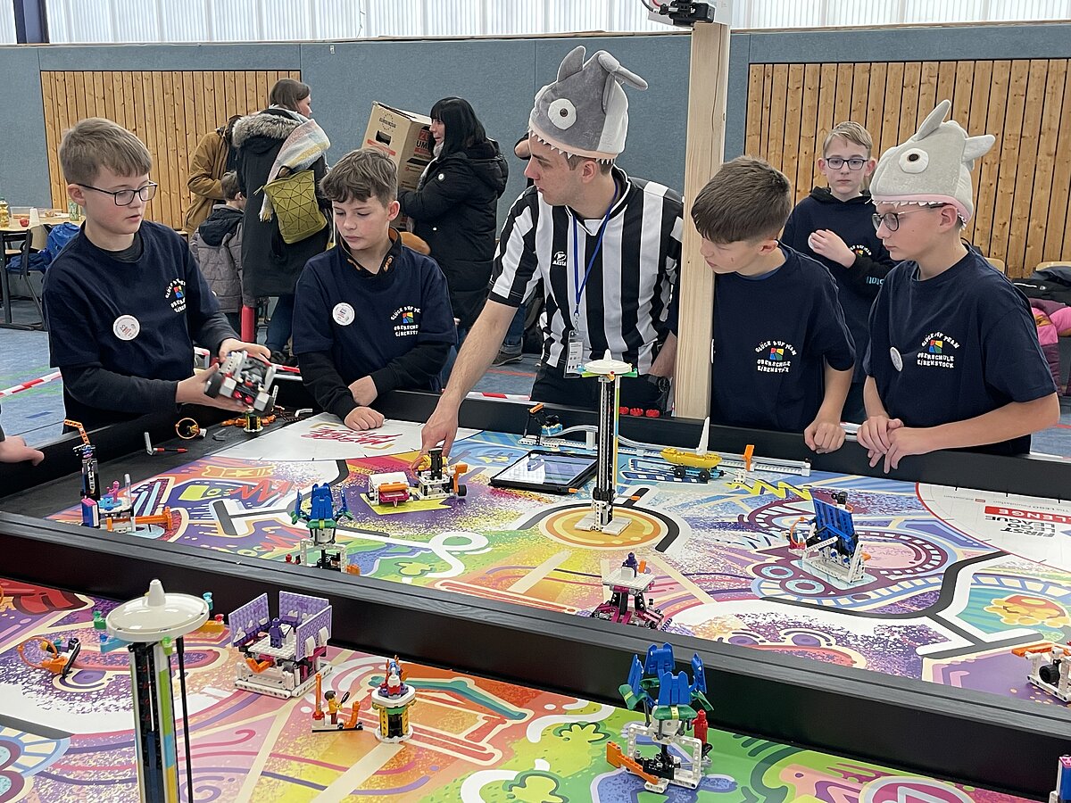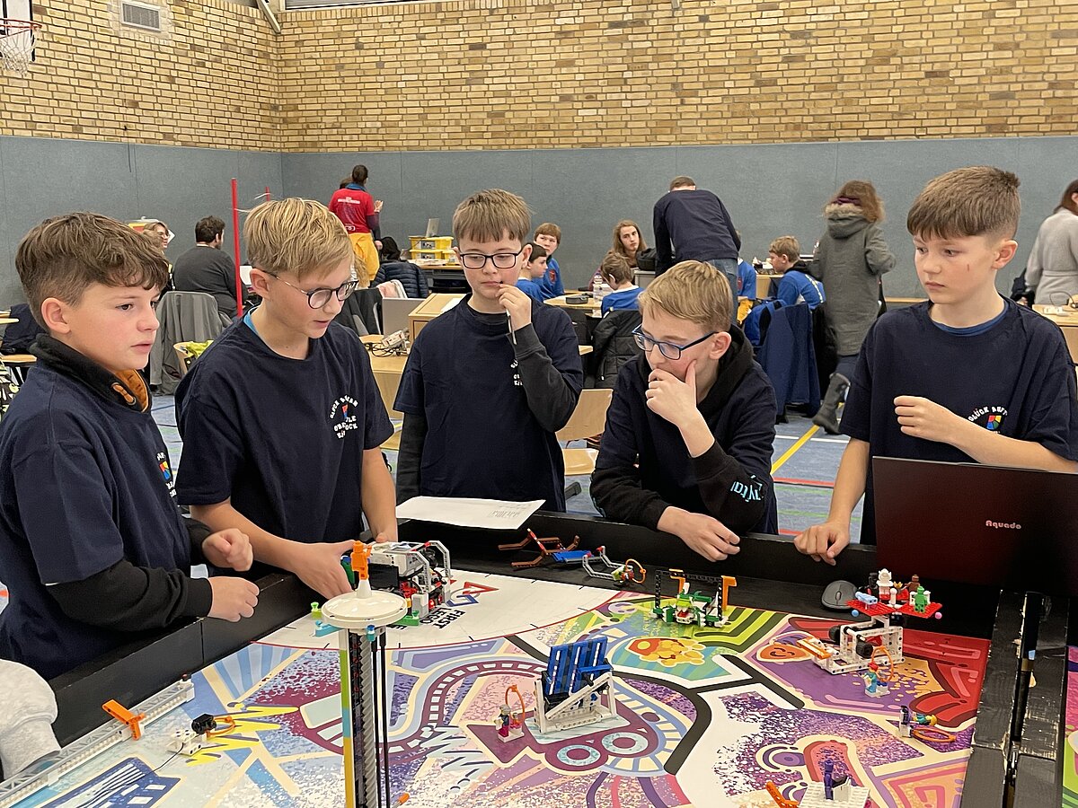 Von den gemeldeten 12 Teams sind 11 anwesend. Unser Team besteht aus 3 „alten Hasen“ und drei neue Mitgliedern, welche sich sehr gut ins Team integriert haben. Ganz konkret sind dies: Arthur Windisch (Klasse 5a), Ian Leibelt, Tom Goldschei und Eddie Rosigkeit (alle drei Klasse 6a) sowie Ben Riedeg – die sechs Schüler werden von Herrn Voigt und Herrn Schieronsky begleitet. Über ein halbes Jahr haben sich alle auf diesen Tag vorbereitet, Roboter gebaut und verbessert sowie die Programme für die Erfüllung der Aufgaben geschrieben.