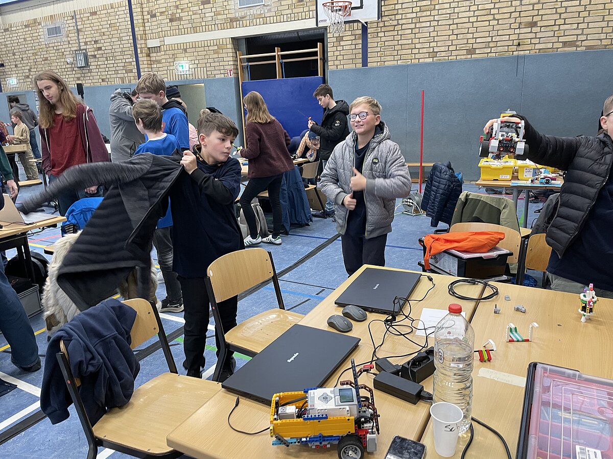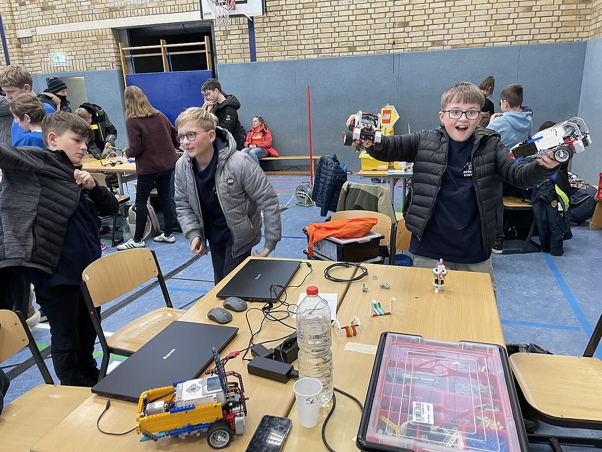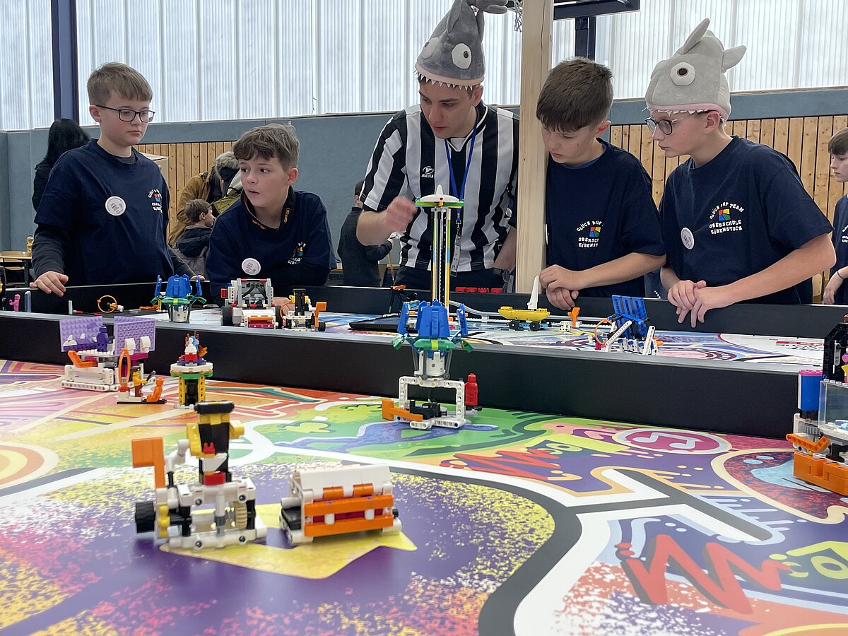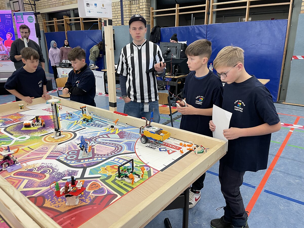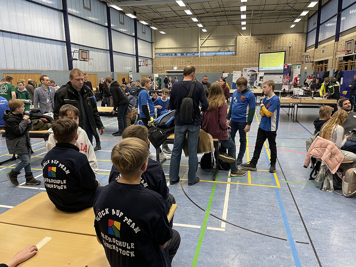 Von den gemeldeten 12 Teams sind 11 anwesend. Unser Team besteht aus 3 „alten Hasen“ und drei neue Mitgliedern, welche sich sehr gut ins Team integriert haben. Ganz konkret sind dies: Arthur Windisch (Klasse 5a), Ian Leibelt, Tom Goldschei und Eddie Rosigkeit (alle drei Klasse 6a) sowie Ben Riedeg – die sechs Schüler werden von Herrn Voigt und Herrn Schieronsky begleitet. Über ein halbes Jahr haben sich alle auf diesen Tag vorbereitet, Roboter gebaut und verbessert sowie die Programme für die Erfüllung der Aufgaben geschrieben.