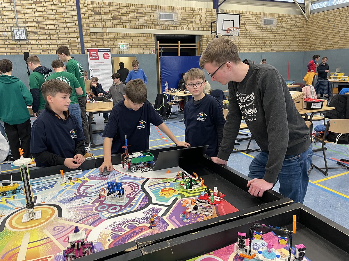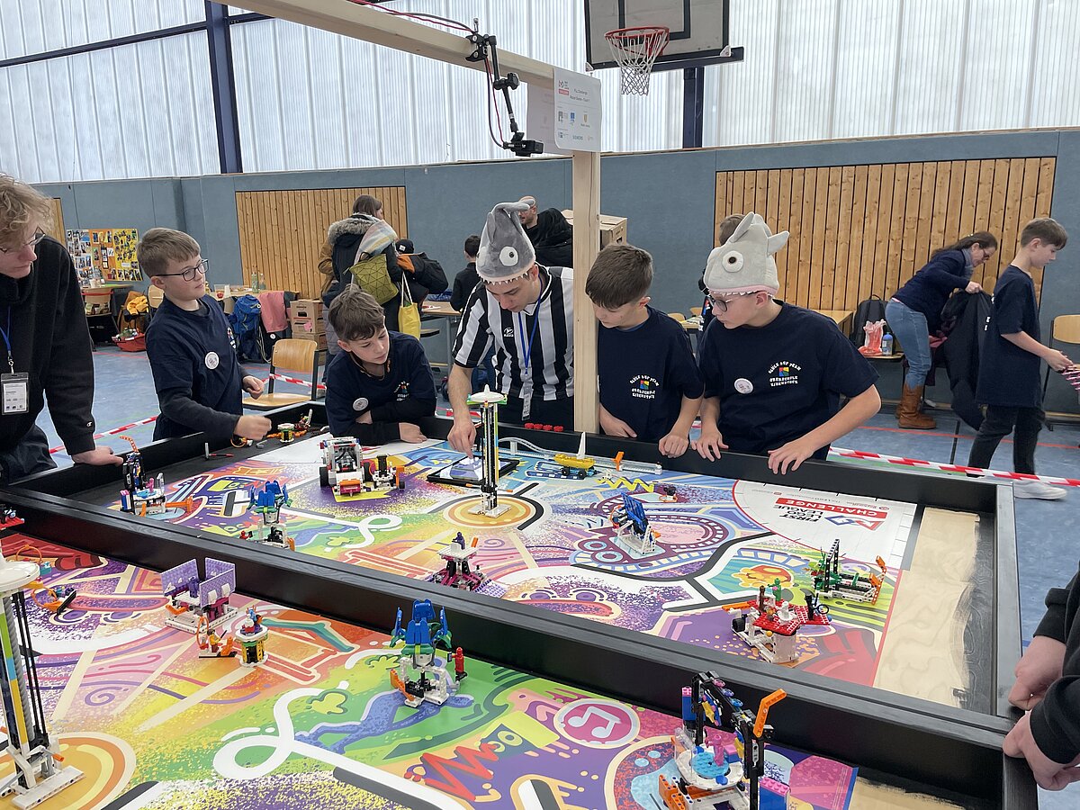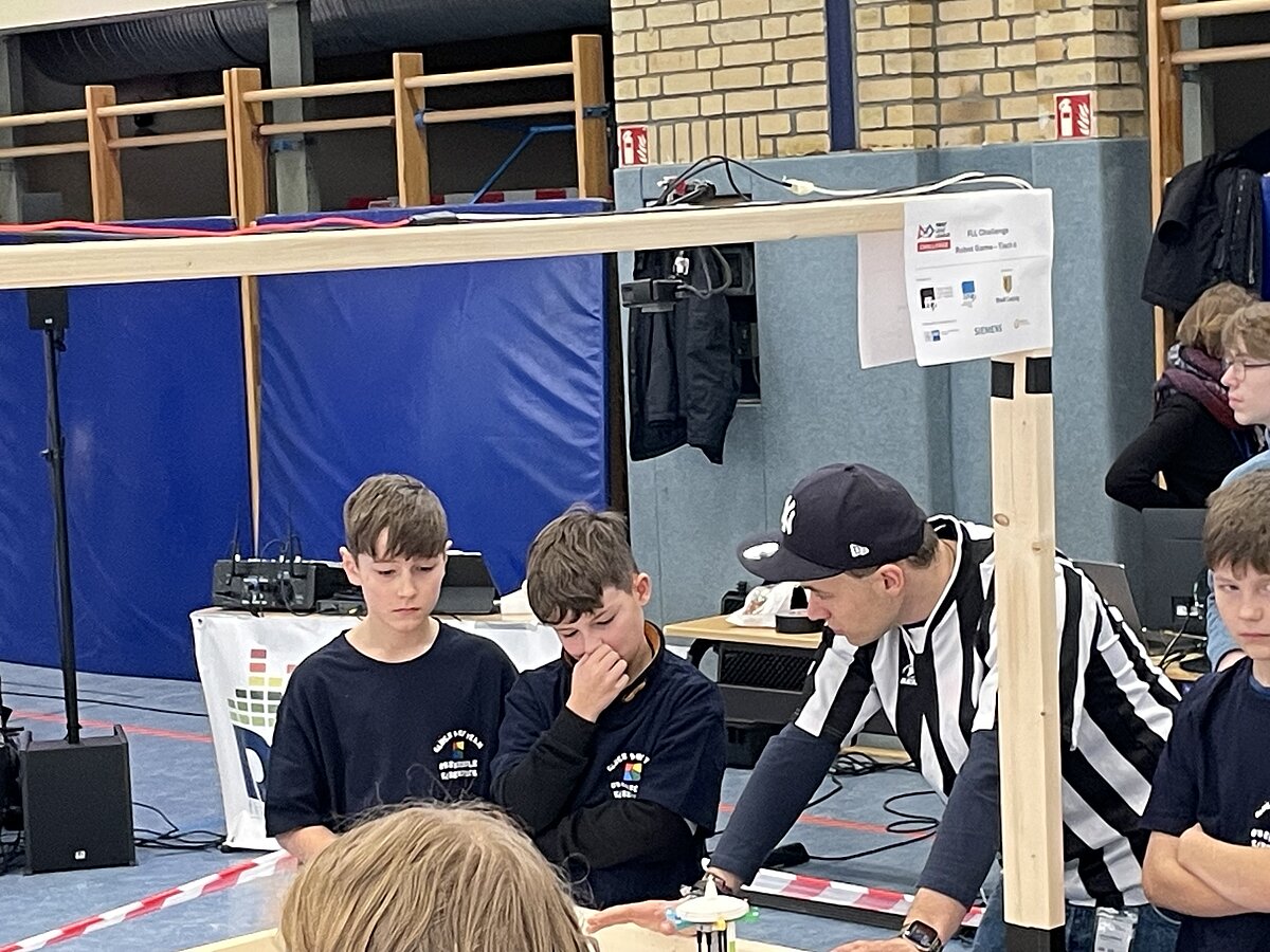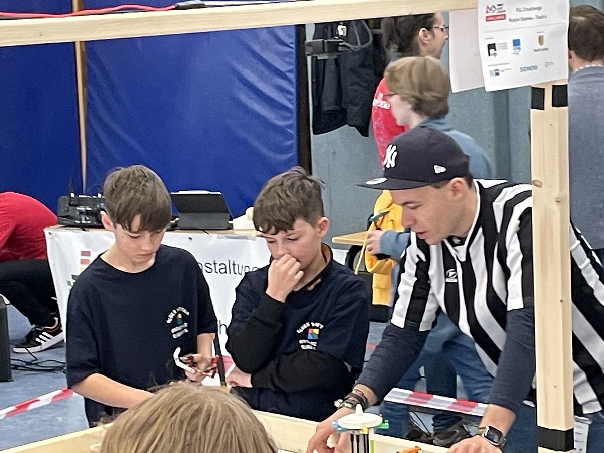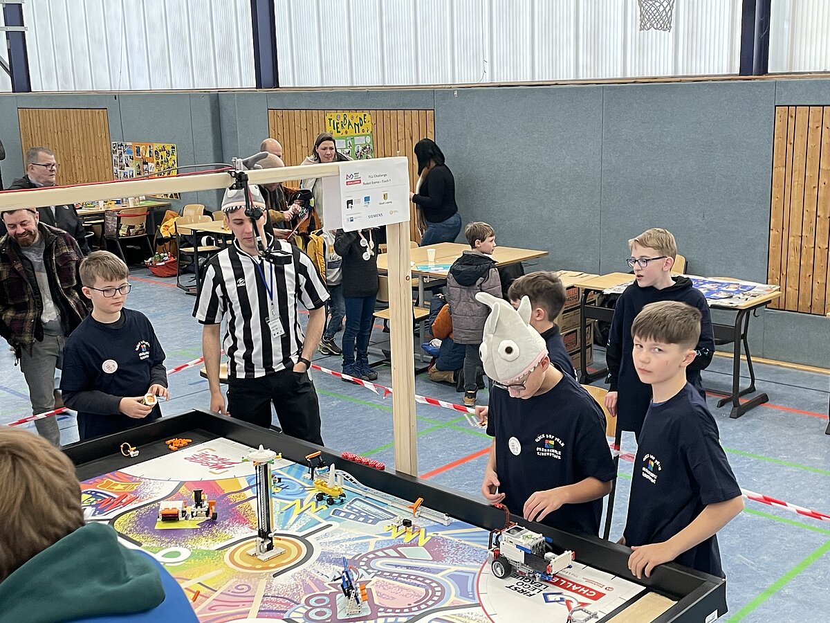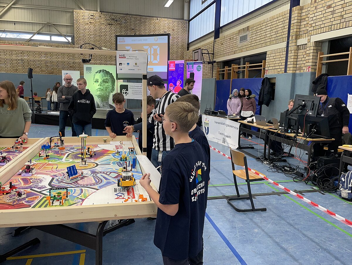 Von den gemeldeten 12 Teams sind 11 anwesend. Unser Team besteht aus 3 „alten Hasen“ und drei neue Mitgliedern, welche sich sehr gut ins Team integriert haben. Ganz konkret sind dies: Arthur Windisch (Klasse 5a), Ian Leibelt, Tom Goldschei und Eddie Rosigkeit (alle drei Klasse 6a) sowie Ben Riedeg – die sechs Schüler werden von Herrn Voigt und Herrn Schieronsky begleitet. Über ein halbes Jahr haben sich alle auf diesen Tag vorbereitet, Roboter gebaut und verbessert sowie die Programme für die Erfüllung der Aufgaben geschrieben.