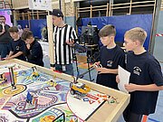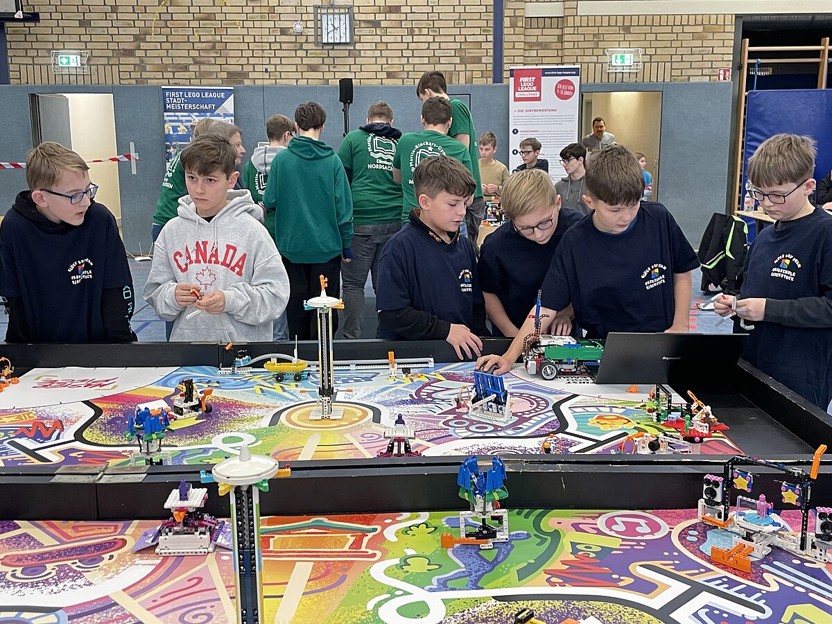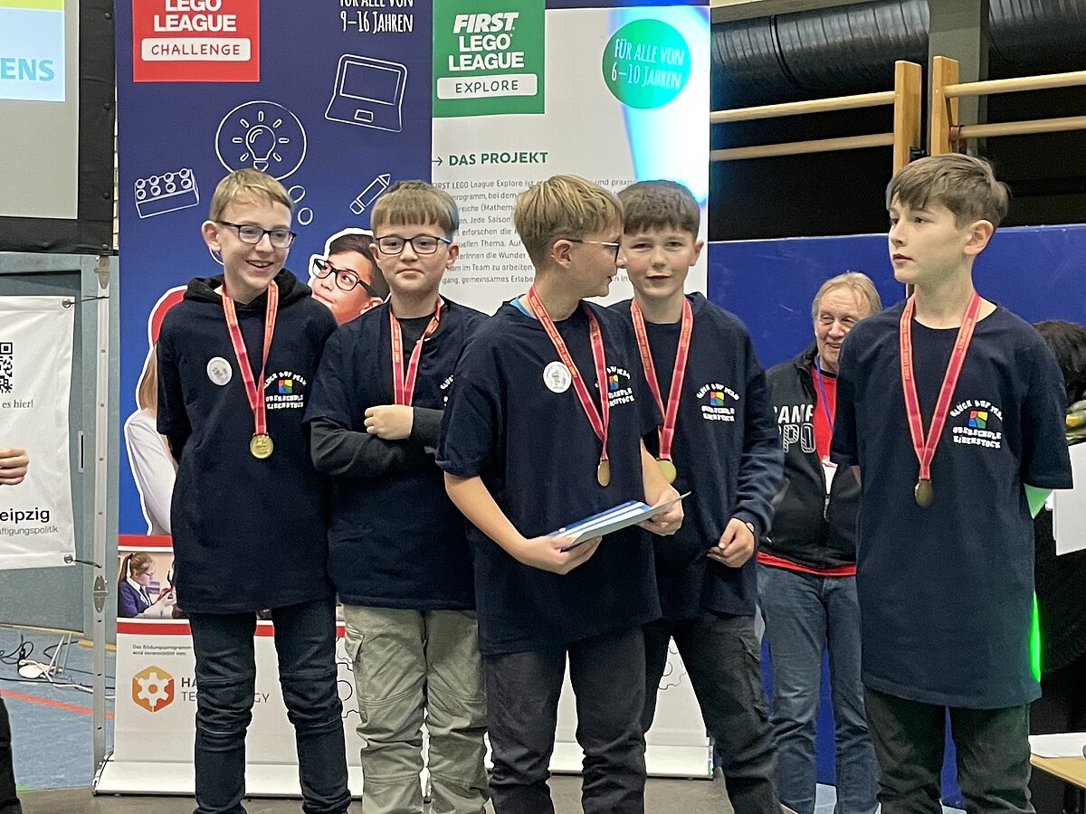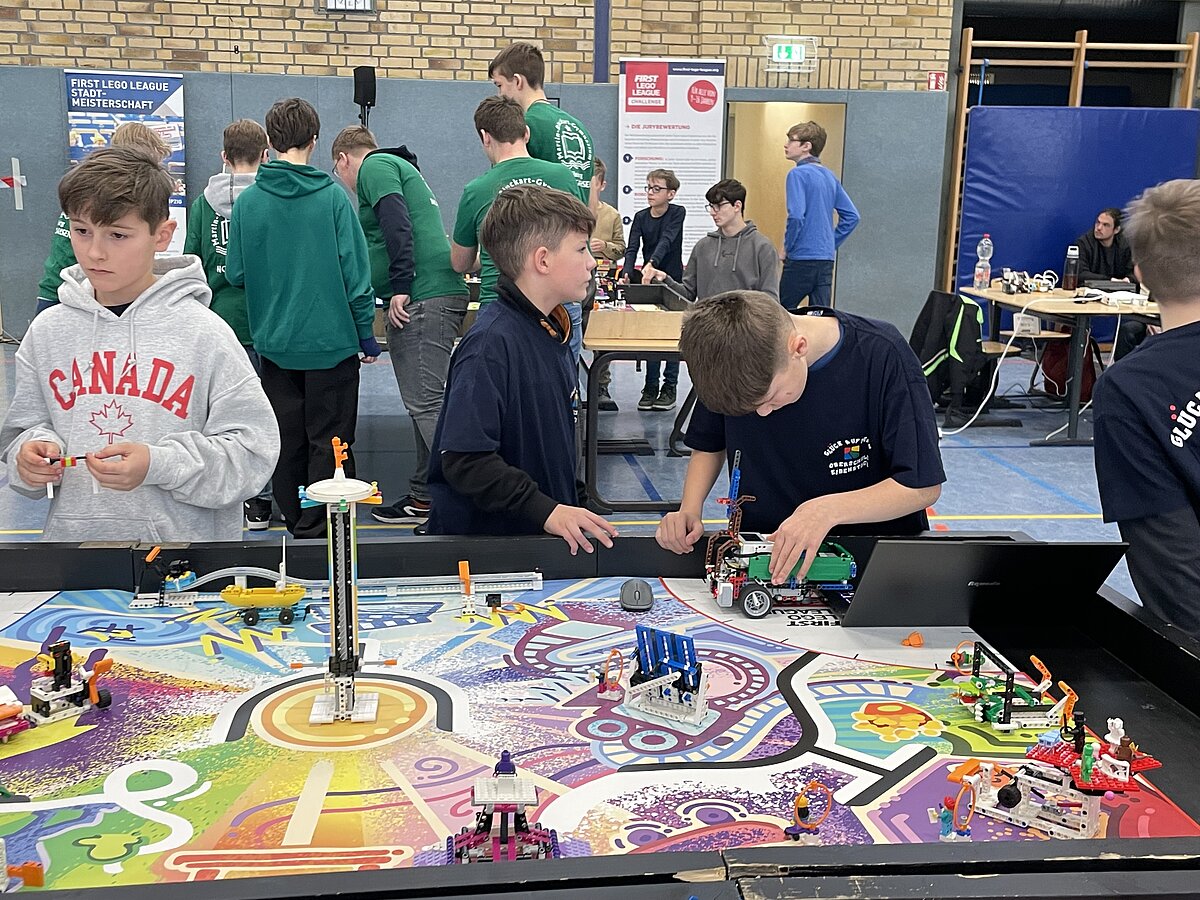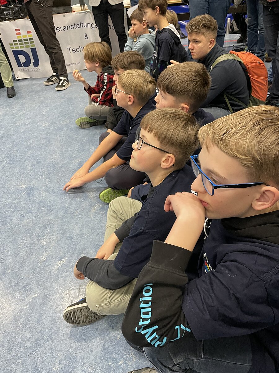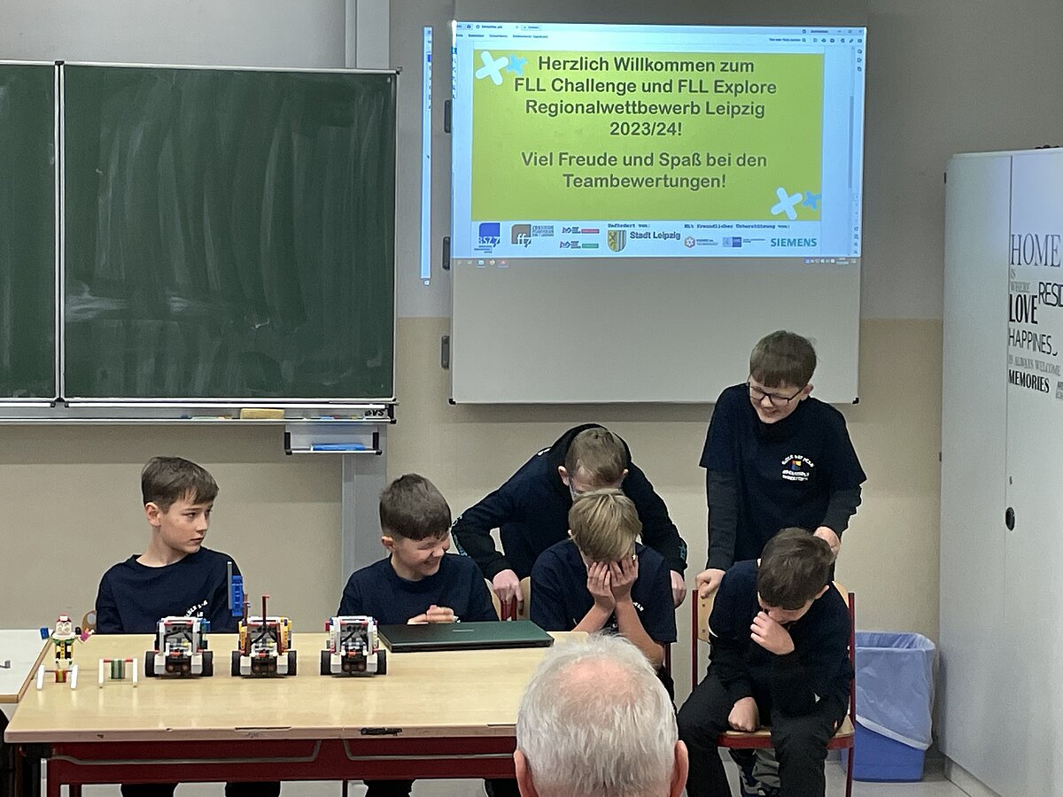 Von den gemeldeten 12 Teams sind 11 anwesend. Unser Team besteht aus 3 „alten Hasen“ und drei neue Mitgliedern, welche sich sehr gut ins Team integriert haben. Ganz konkret sind dies: Arthur Windisch (Klasse 5a), Ian Leibelt, Tom Goldschei und Eddie Rosigkeit (alle drei Klasse 6a) sowie Ben Riedeg – die sechs Schüler werden von Herrn Voigt und Herrn Schieronsky begleitet. Über ein halbes Jahr haben sich alle auf diesen Tag vorbereitet, Roboter gebaut und verbessert sowie die Programme für die Erfüllung der Aufgaben geschrieben.