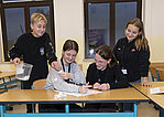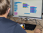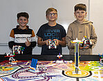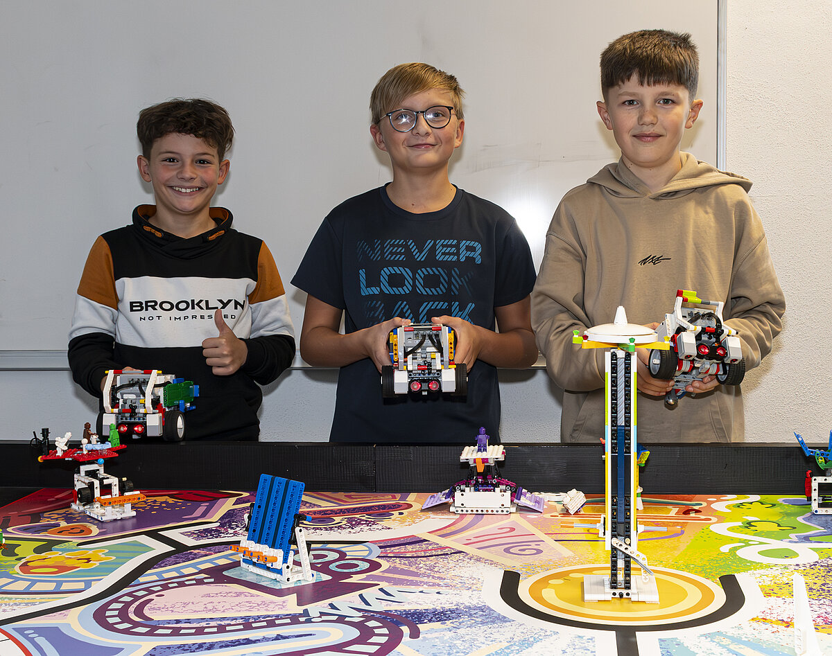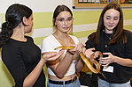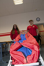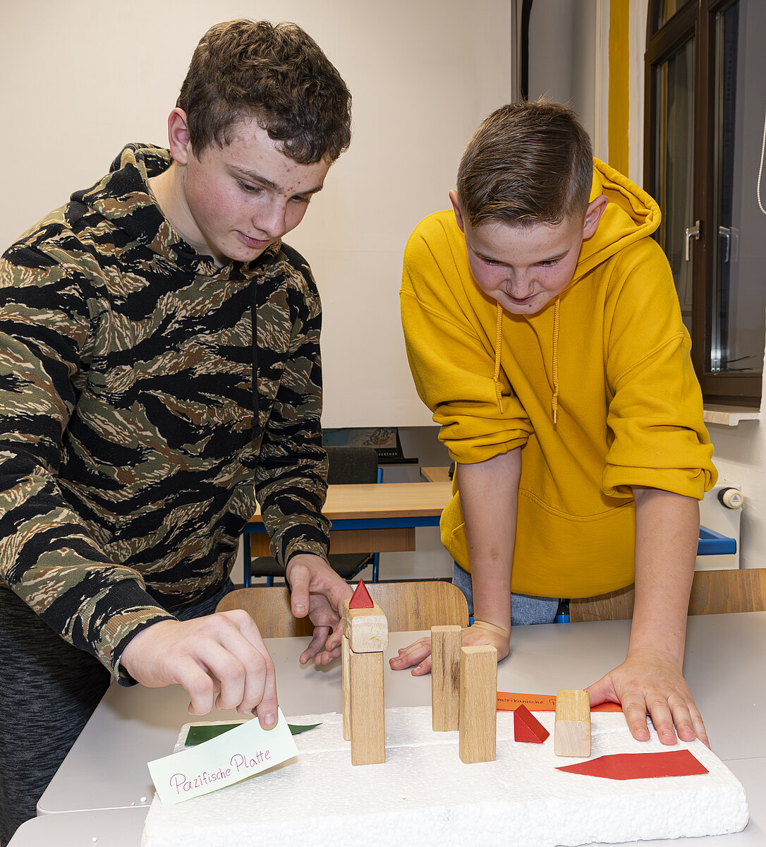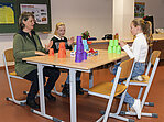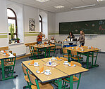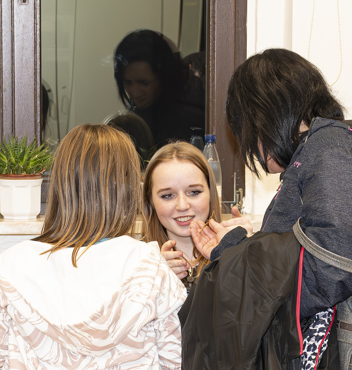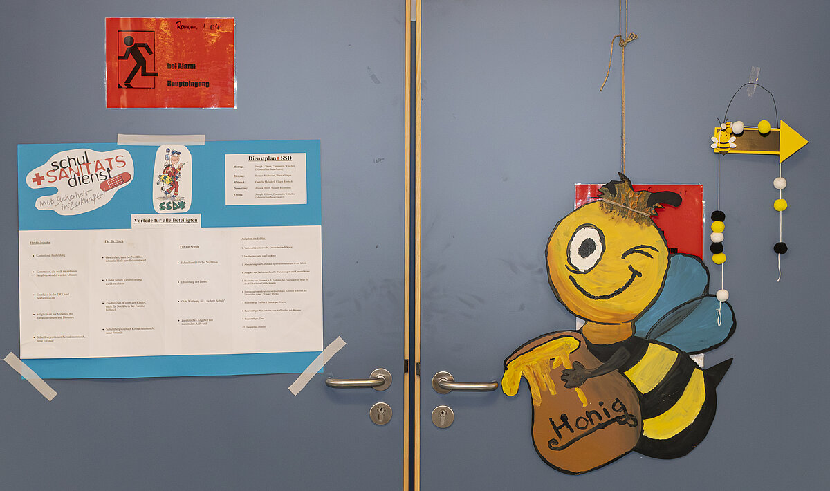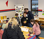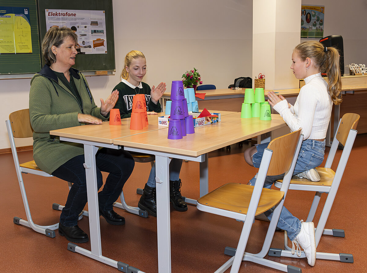 Im Nebengebäude ging die Show weiter. Unterm Dach war ein Klangstudio aufgebaut. Hier genoss man neben beruhigenden Klängen auch den herrlichen Ausblick auf den Adlerfelsen mit Skihang. Eine Etage tiefer zeigten junge Programmierer ihr Können am Robotertisch. Computer eignen sich auch zum Trainieren der Rechtschreibung. Den Beweis trat die LRS-Förderung im Computerzimmer an. In der ersten Etage konnte man gleich fünf Zimmer besuchen. Der Korridor trägt rot. Das passte zu den Schulsanitätern, die von der Bergwacht unterstützt wurden. Gegenüber summte es im Bienenstock. Bienenwaben und Wachs waren zu bestaunen. Honig und Kerzen konnte man erwerben. Beim Betreten des Spanischzimmers kam einem alles erst einmal Spanisch vor. Stand da ein Esel vor einer Hütte? In der Schulbibliothek präsentierten sich die Lesescouts. Hier ist man immer auf der Suche nach Nachwuchs. Und schließlich wartete gegenüber unser Sozialarbeiter auf Kundschaft. Er bietet seine Hilfe für alle Probleme des jungen Schülerlebens an. Nun stand ein längerer Weg in die Turnhalle an. Tischtennis und leichte Bewegungsspiele luden zum Mitmachen ein.