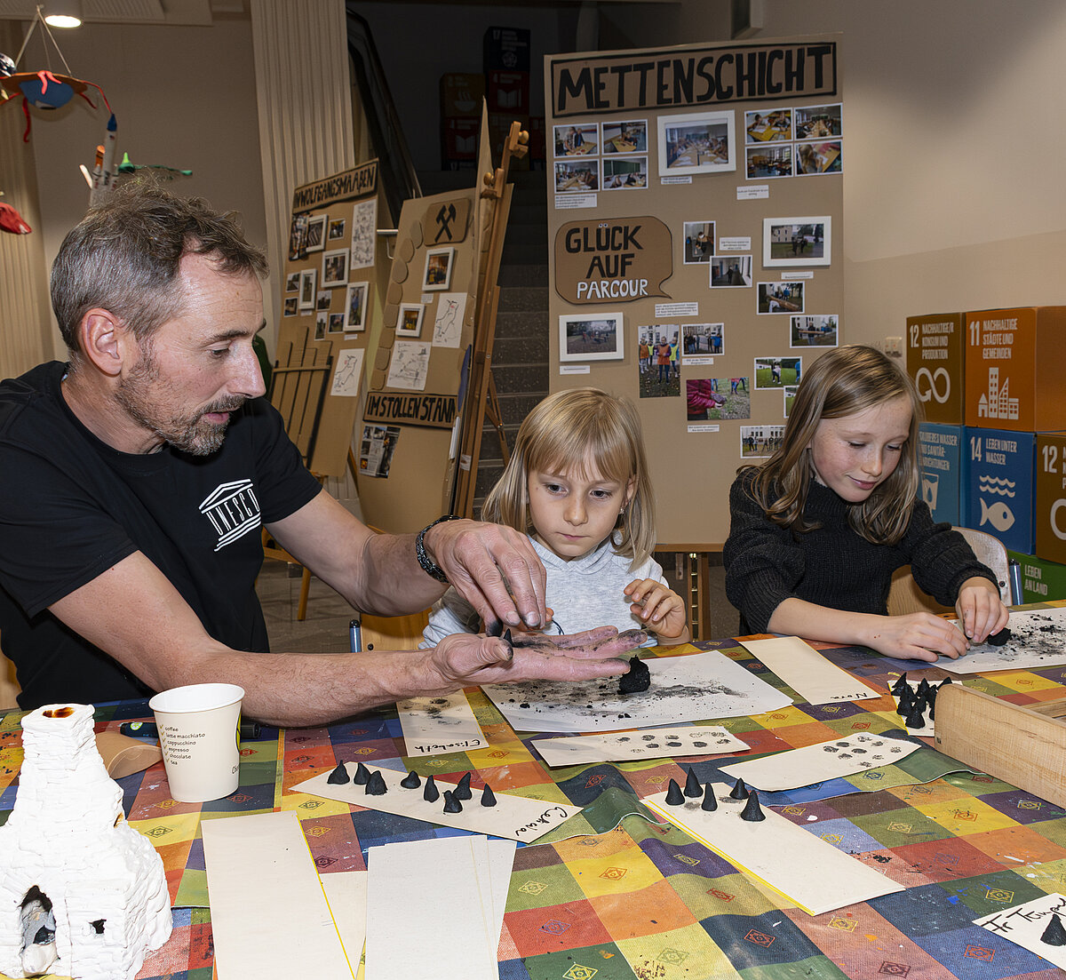 Ganz oben wird es gelb. Ein Schritt um die Ecke und man befand sich in einer erzgebirgischen Märchenwelt. Wer wollte konnte Räucherkerzen formen, sich in der Sitzecke rumlümmeln oder einen Kinderpunsch genießen. Politisch wurde es beim Schülerrat, Spannend beim Quiz im Englischzimmer und ganz hinten in der Geografie drifteten tektonische Platten aufeinander. Wer nicht mehr laufen konnte, nahm anschließend den Fahrstuhl nach unten.
