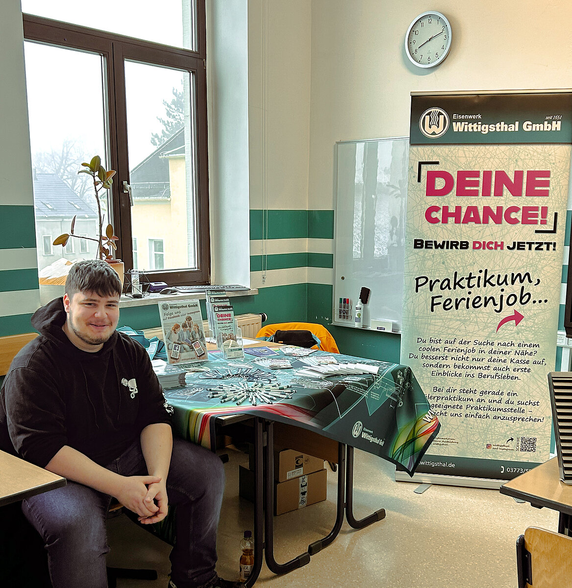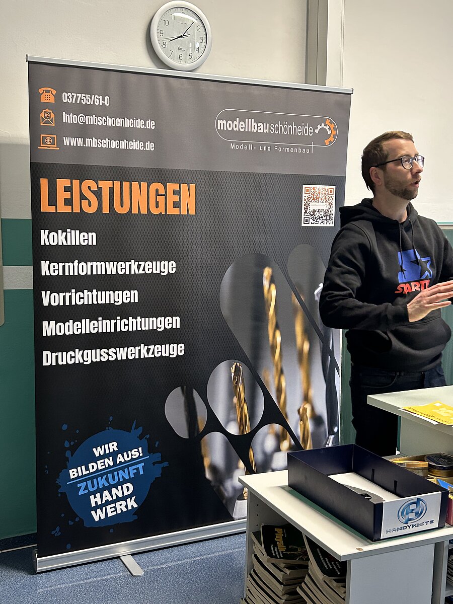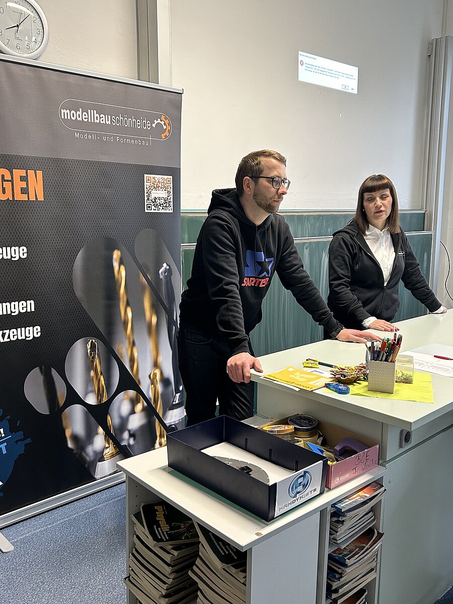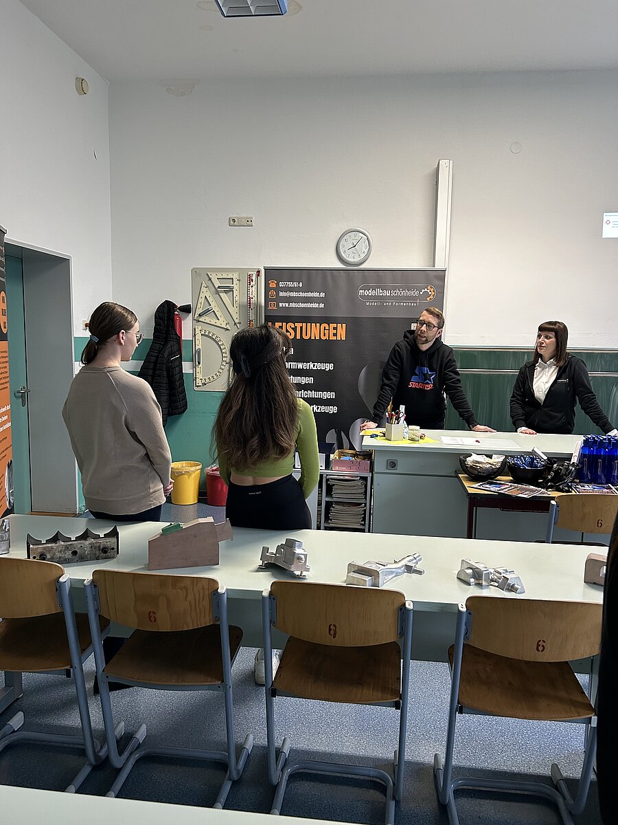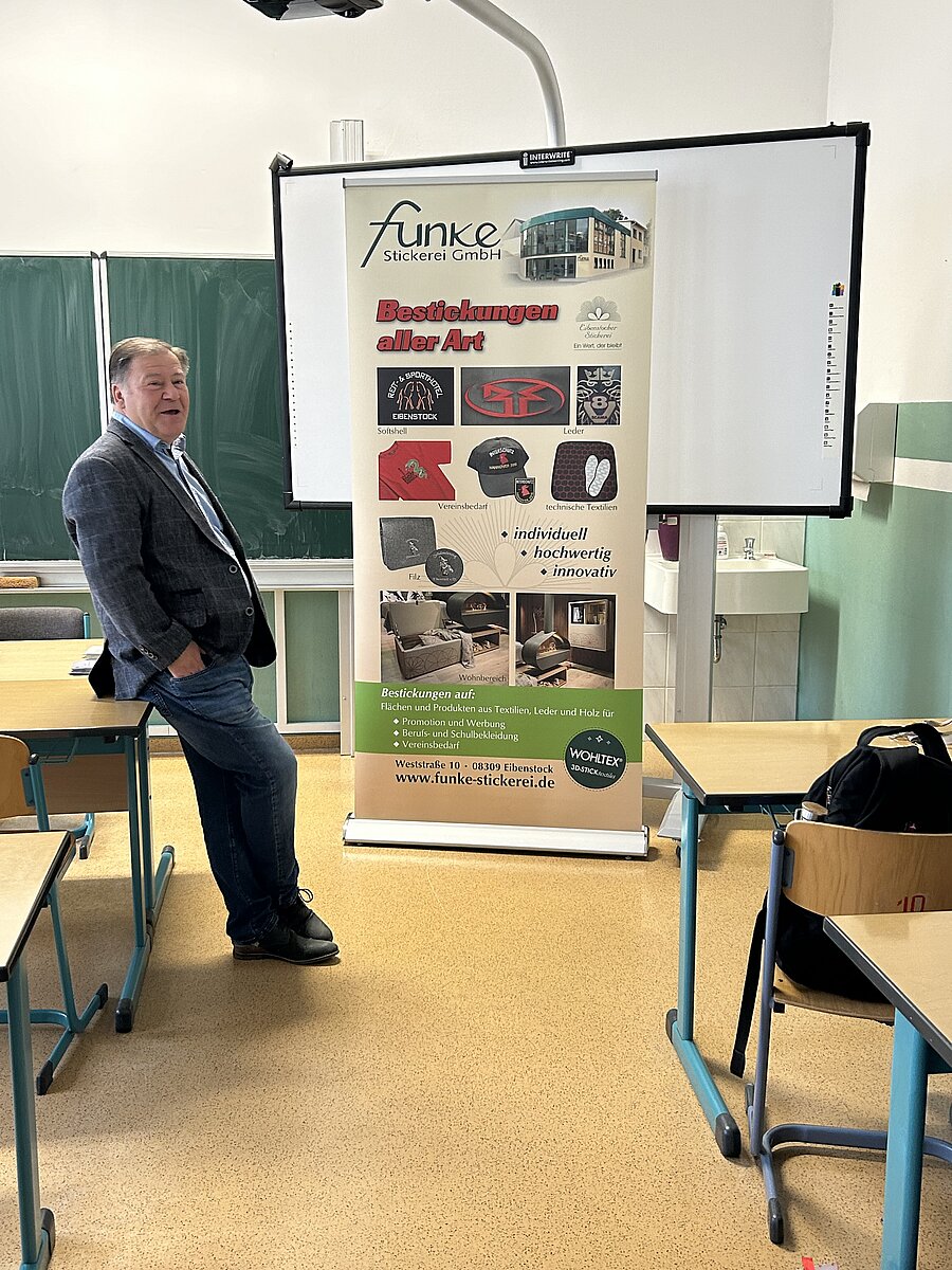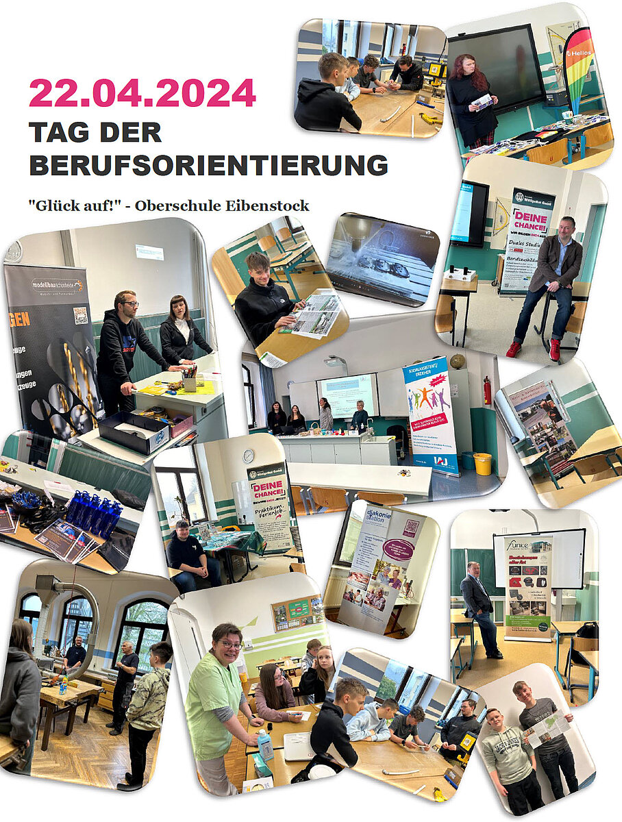 Neun regionale Firmen (Firma Funke Stickerei GmbH & Reit- und Sporthotel Eibenstock, Diakoniestation der Kirchgemeinden Eibenstock und Umgebung e.V., Firma PTSE GmbH, Firma Elektrowerkzeuge GmbH Eibenstock, Dietel Haustechnik GmbH & Co KG, Eisenwerk Wittigsthal GmbH, Modellbau Schönheide GmbH, Helios Klinikum Aue) sowie die Fachschule für Sozialwesen sind der Einladung unserer Schule gefolgt und haben sich am 22.04.2024 in mehreren Durchgängen à 45 Minuten den interessierten Schülerinnen und Schülern der beiden Klassenstufen präsentiert.
