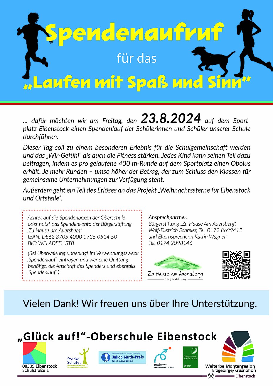 Wir möchten Ihnen gern die Hintergründe dieser Spendenaktion erklären. Auf Initiative der Elternsprecherin Katrin Wagner findet am 23.08.2024 der Spendenlauf der „Glück auf!“ - Oberschule Eibenstock statt.