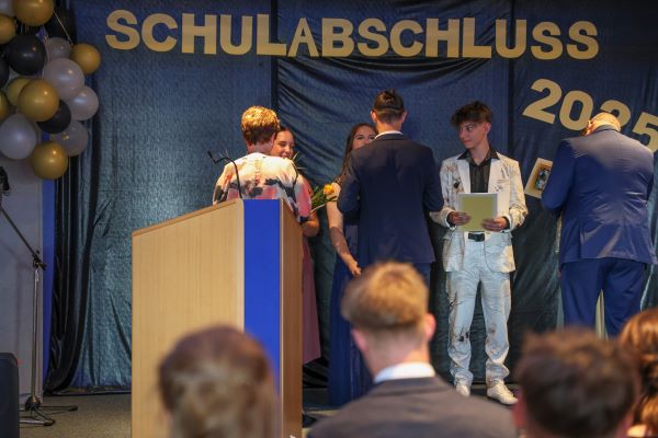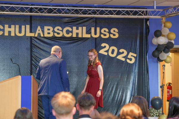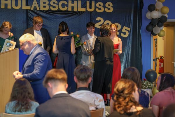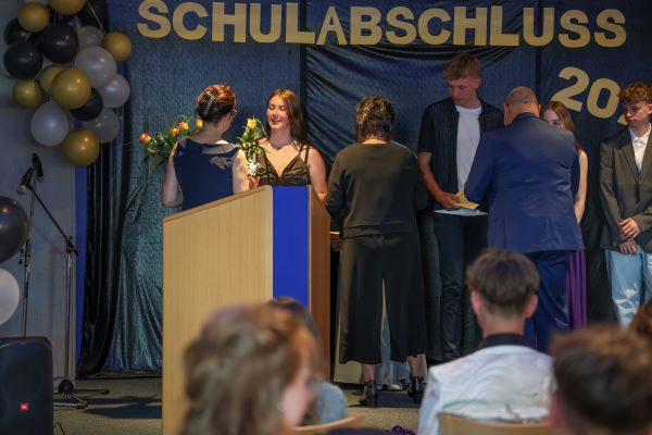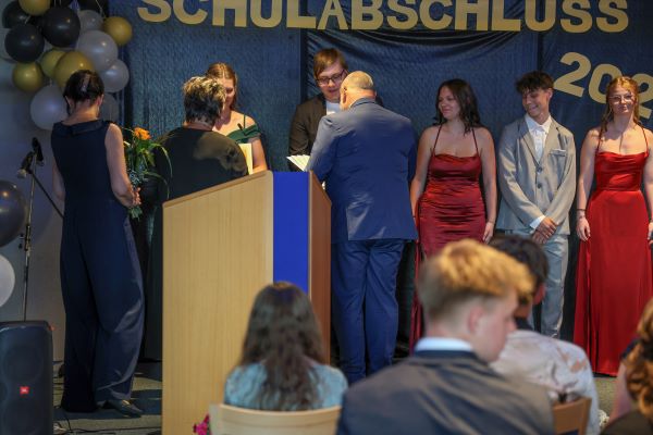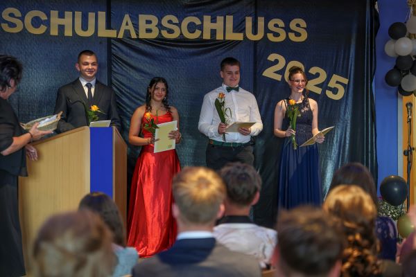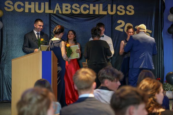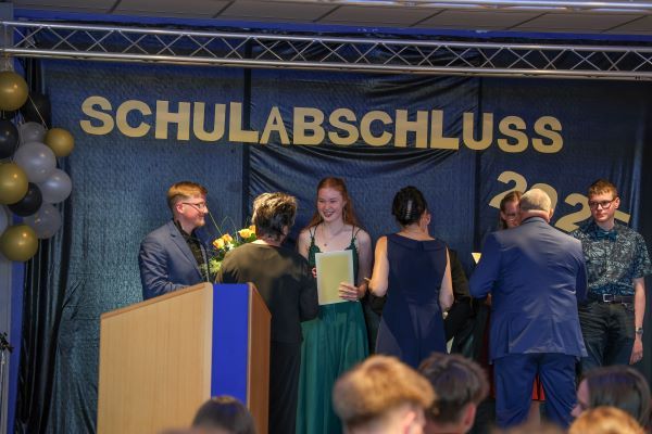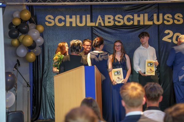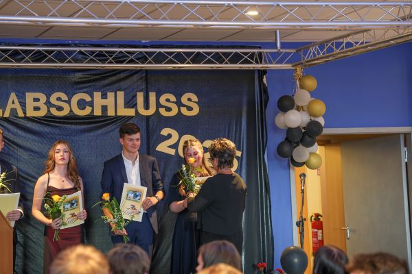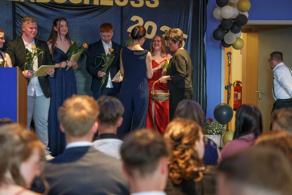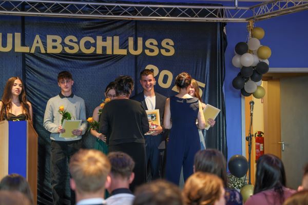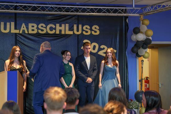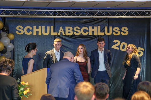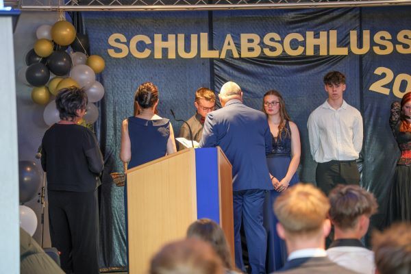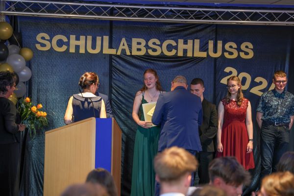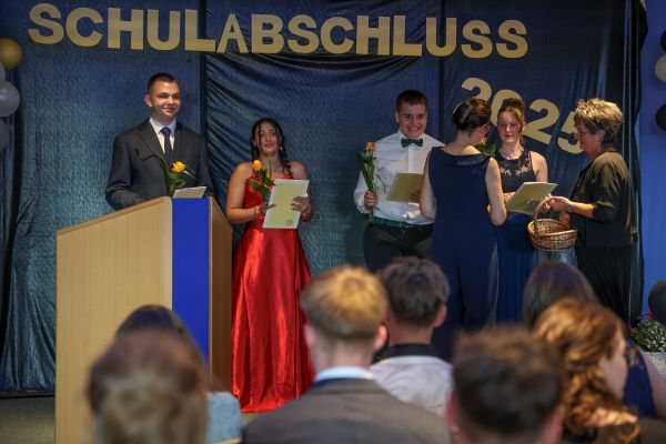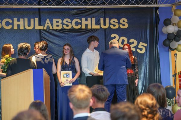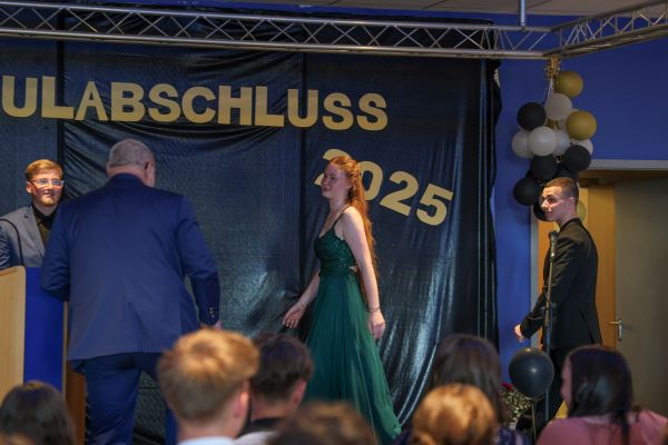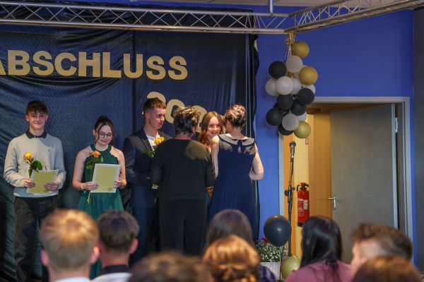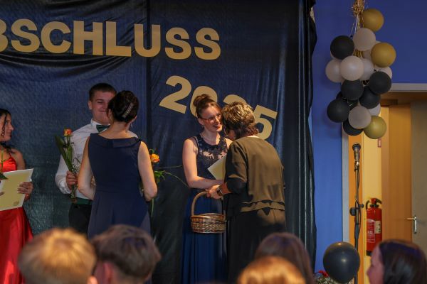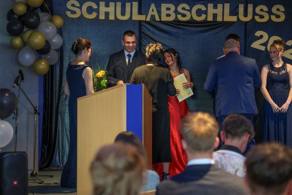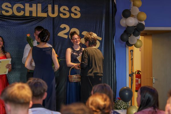 Der Höhepunkt war die feierliche Zeugnisausgabe. Die Schülerinnen und Schüler traten in Gruppen nacheinander auf die Bühne, um ihre Zeugnisse entgegenzunehmen. Die Klassenleiter und der Schulleiter überreichten die Dokumente, oft begleitet von einer herzlichen Umarmung und ein paar persönlichen Worten. Dieser Moment markierte offiziell den Abschluss ihrer Zeit an der “Glück auf!” - Oberschule Eibenstock und wurde von den stolzen Eltern und Verwandten und dem Applaus der Mitschüler begleitet.