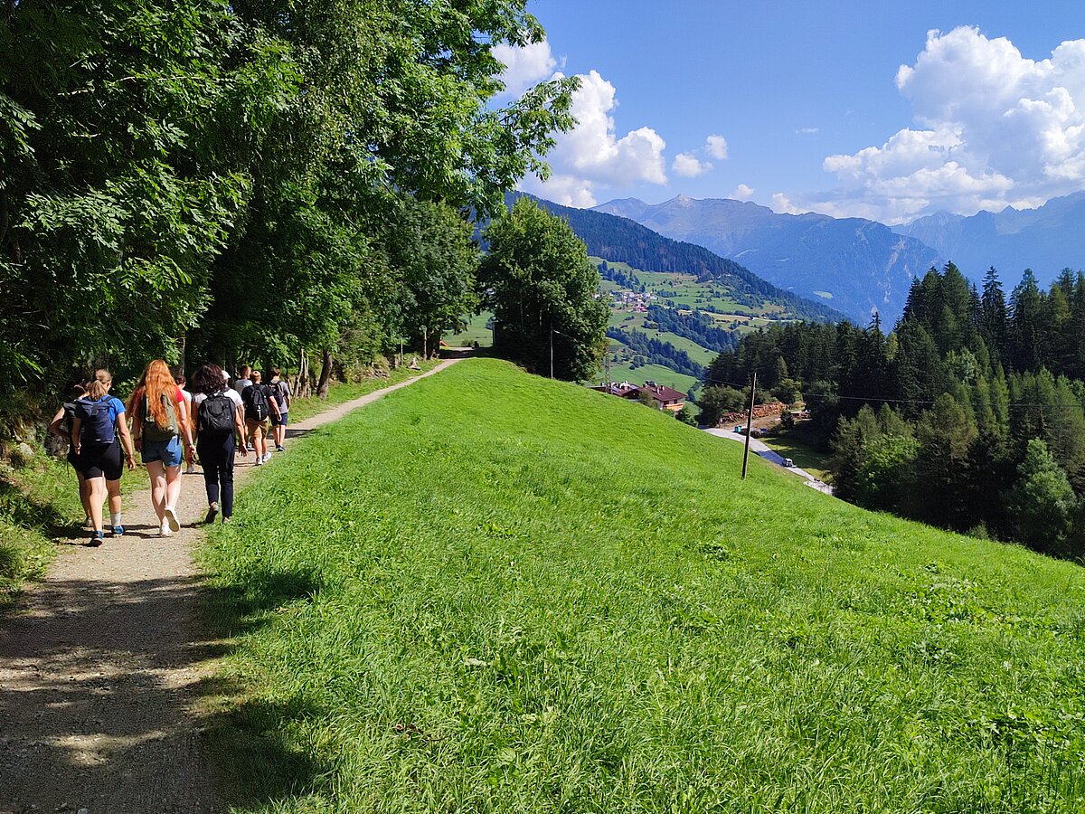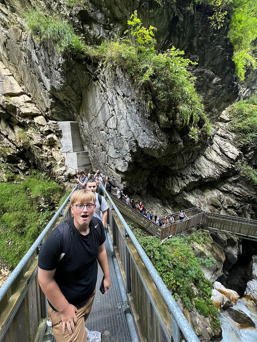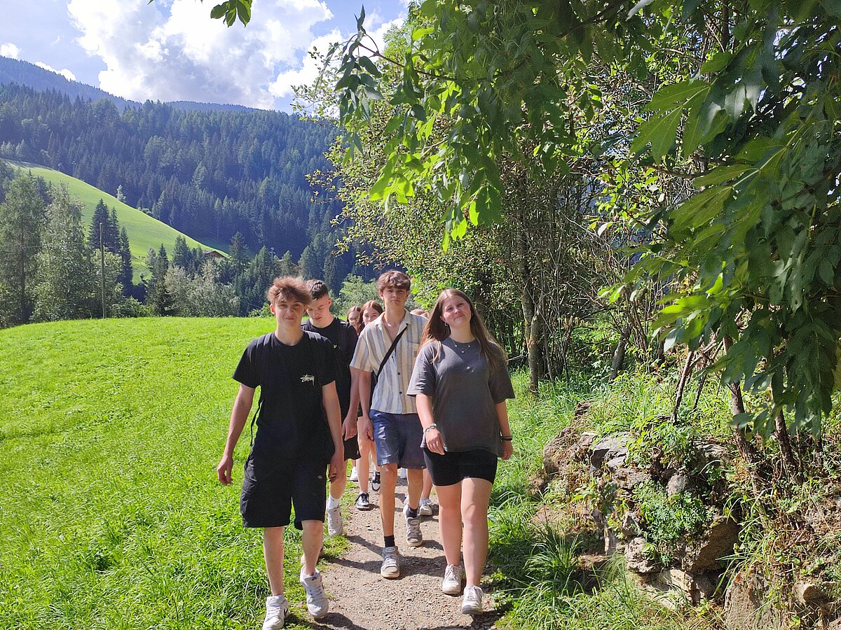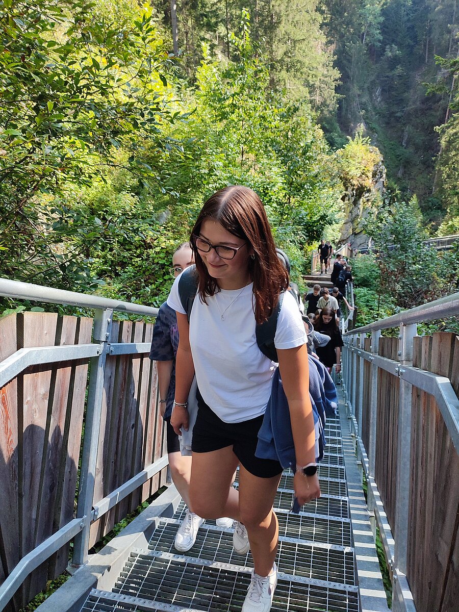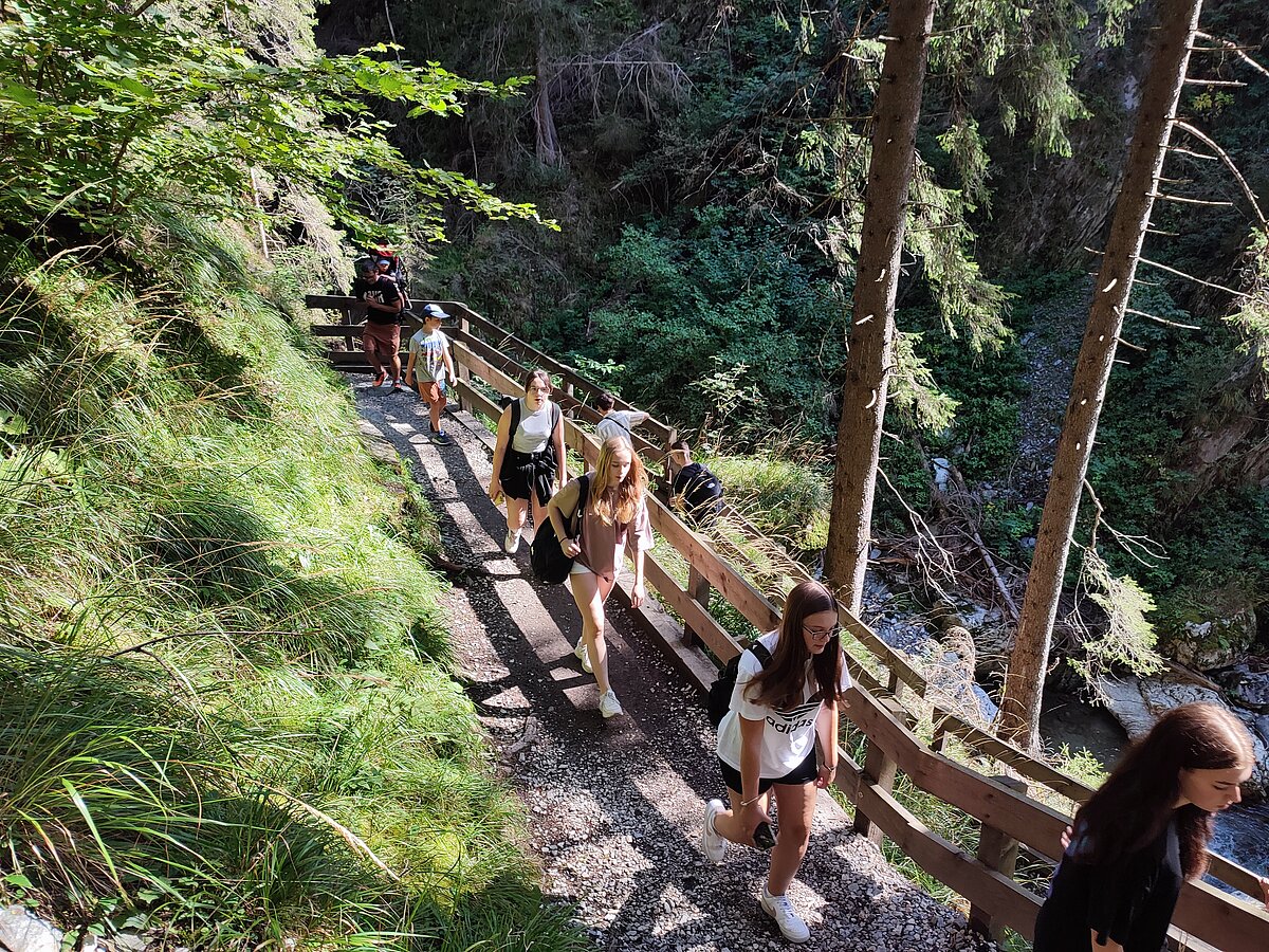 Am Dienstag-Morgen standen wir um 7:00 Uhr auf, um nach dem reichhaltigen Frühstück die Fahrt zur „Gilfenklamm“ anzutreten. Angekommen erwartete uns ein dreißigminütiger Fußmarsch bis zur Klamm. Durch die enge Schlucht ging es immer weiter hinauf, während man türkis-blaues Wasser und beeindruckende Wasserfälle bestaunen konnte. Erschöpft oben angekommen, legten wir eine kurze Pause ein, bevor wir der kleinen Kapelle auf dem Berg einen Besuch abstatteten. Nachdem wir den Abstieg geschafft hatten, ging es für uns weiter mit dem Bus nach Brixen. Dort angelangt, durften wir in Gruppen die Stadt erkunden. Echtes, italienisches „Gelato“ (Eis) versüßte uns den heißen Sommertag. Am Nachmittag freuten sich alle auf das kühlende Nass. Mit unseren Lehrern endete der Abend auf dem Balkon.