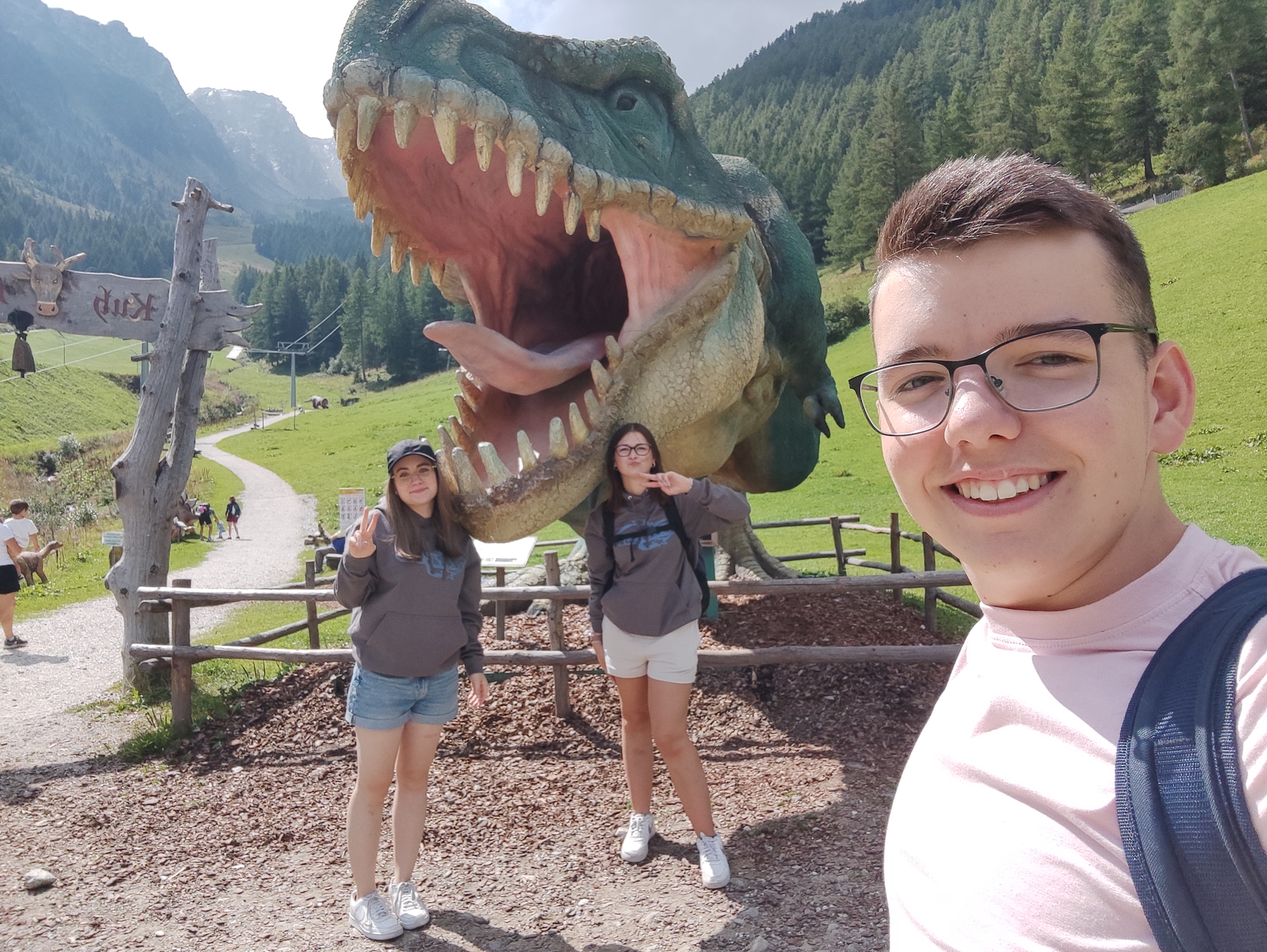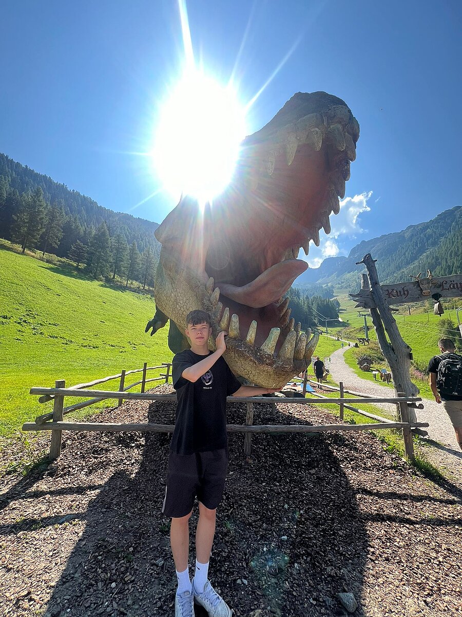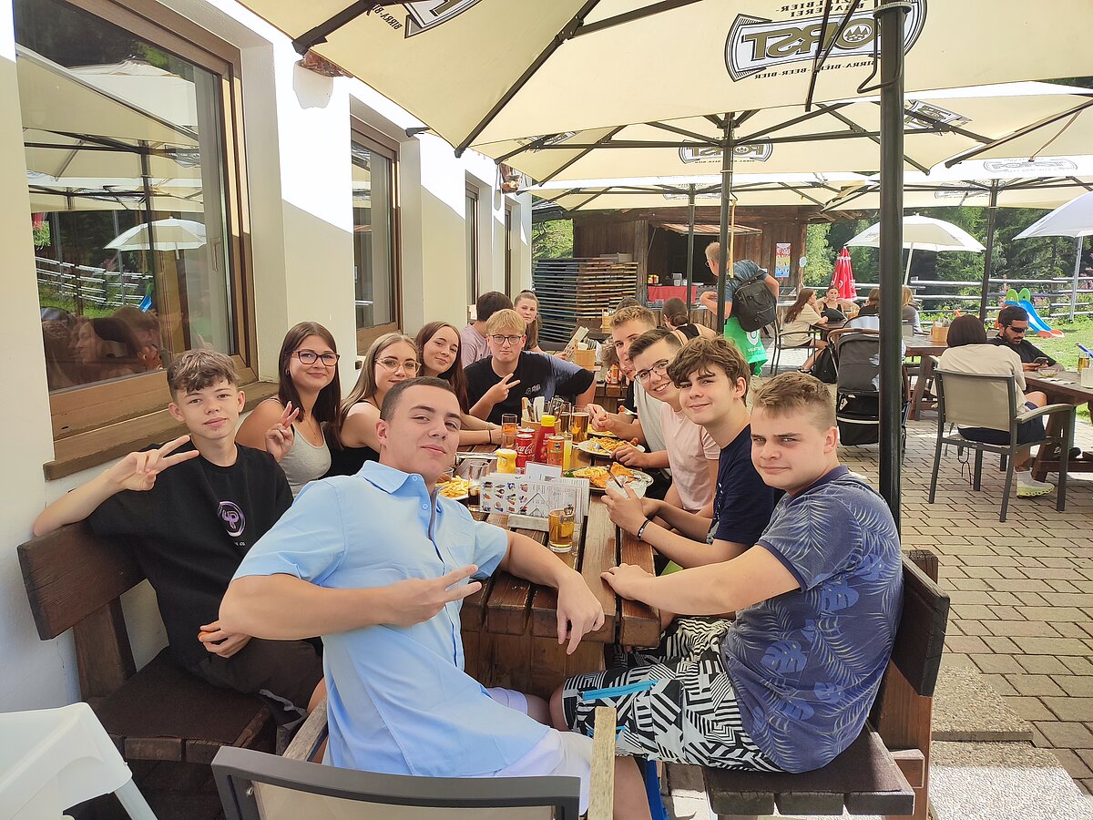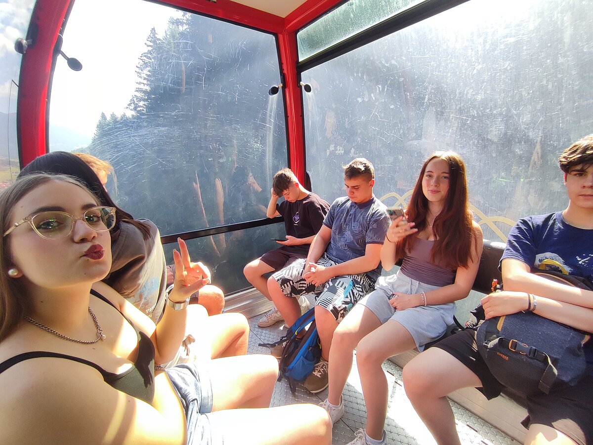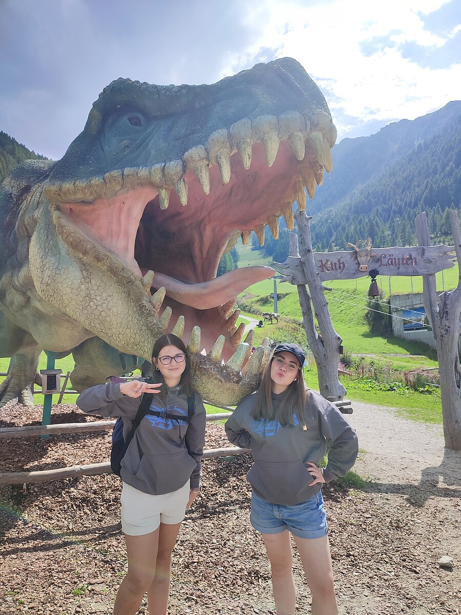 Auf dem Hochplateau erwartete uns ein Dinosaurier-Park, ein Abenteuerspielplatz und auch ein Wasserspielplatz, der besonders den Jungs sehr gefallen hat. Ein paar Wagemutige flogen mit der Zipline zur Alm. Nach einem üppigen Mittagessen in der traditionellen Almhütte, freuten wir uns auf die „Klausbergflitzer.“ Mit der 1800m langen Bobbahn düsten wir zu zweit, oder allein in Richtung Tal. Ein riesiger Spaß, für Schüler und Lehrer. Ein letztes Mal konnten wir am Nachmittag den kühlen Pool nutzen, bevor wir am Abend als Klassenverband den Tag ausklingen ließen.