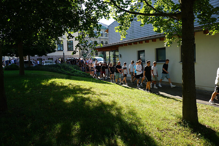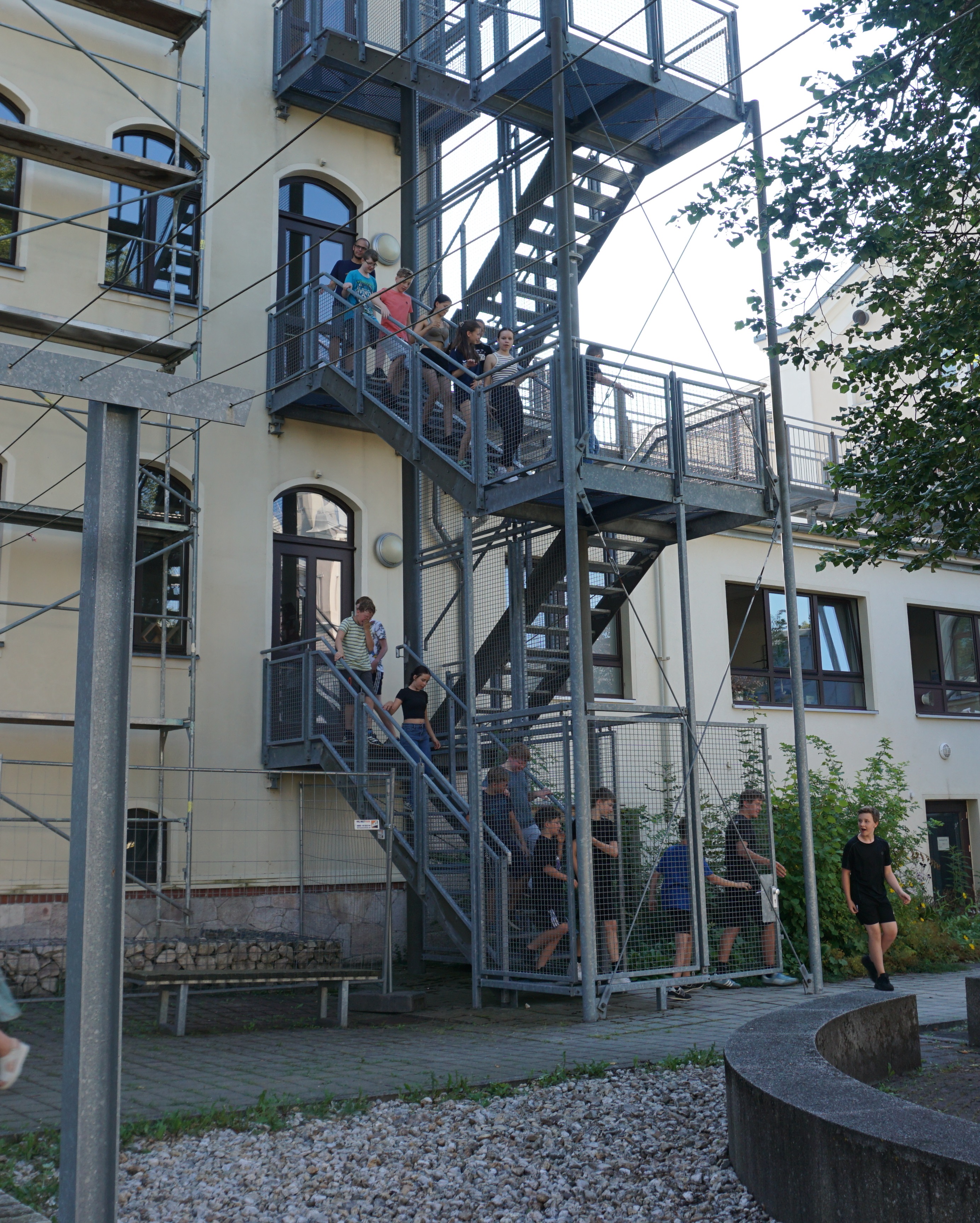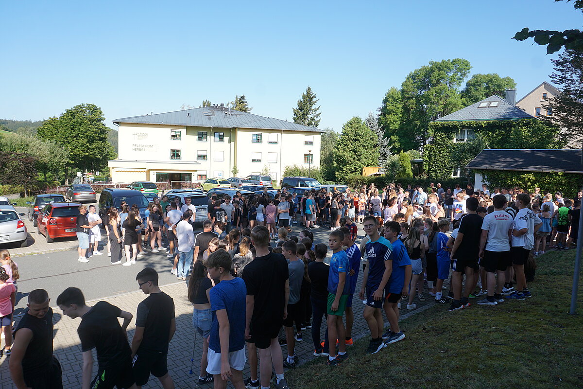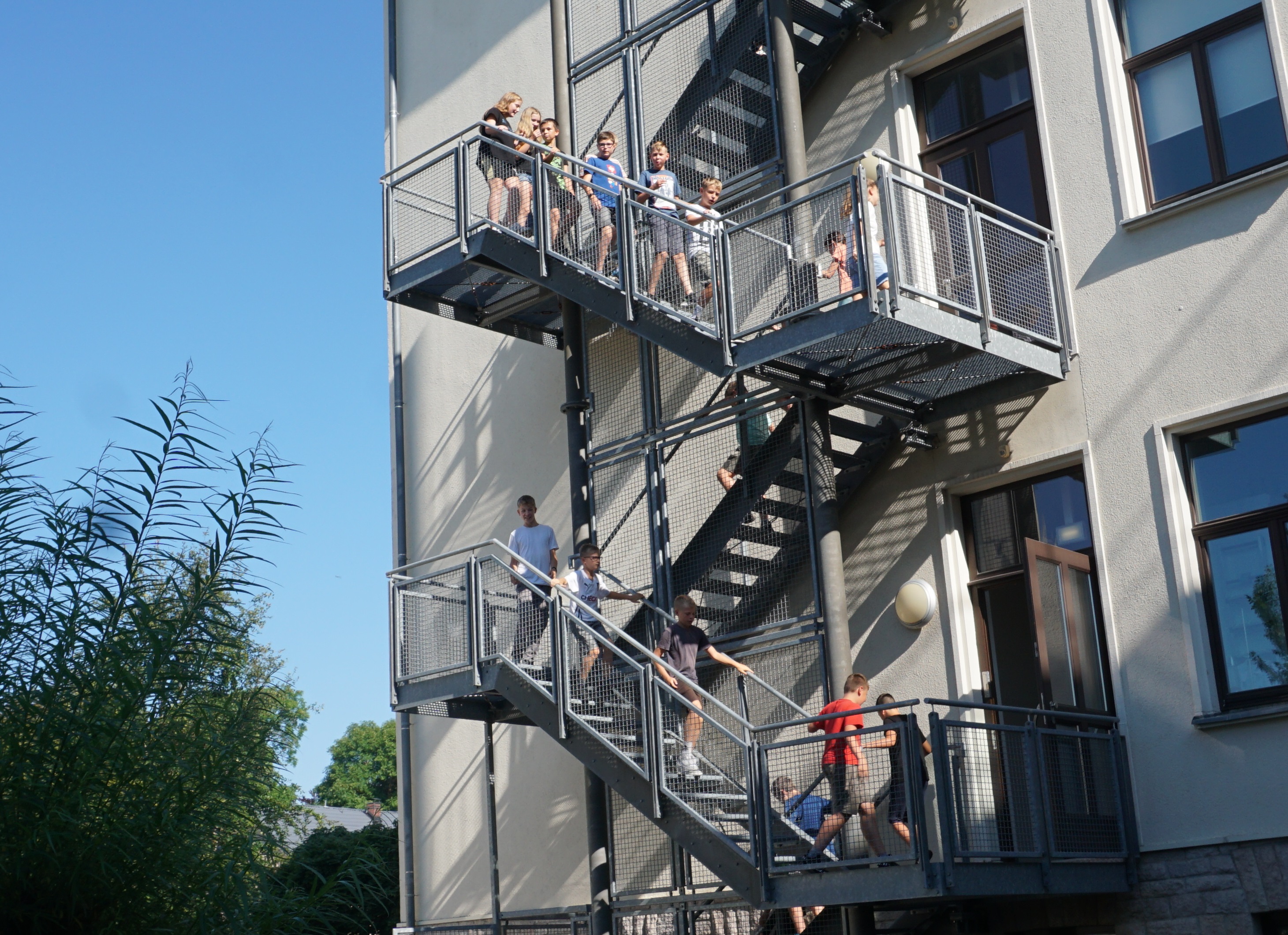 Ziel dieser Alarmproben ist es, das richtige Verhalten für einen eventuellen Ernstfall zu üben. Innerhalb von 5 Minuten und 30 Sekunden war das gesamte Schulgebäude vollständig geräumt. Die Klassen verließen geordnet ihre Klassenräume, schlossen Fenster und Türen und begaben sich zügig zu den Notausgängen. Trotz der Eile verlief alles ruhig und ohne Hektik. Wie in den vergangenen Jahren eine erfolgreiche Übung. Auf dem festgelegten Sammelplatz hinter der Auersberghalle angekommen, überprüften die Klassensprecherinnen und Klassensprecher die Vollzähligkeit ihrer Klasse und meldeten diese der Schulsekretärin.
