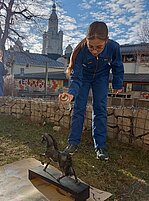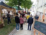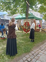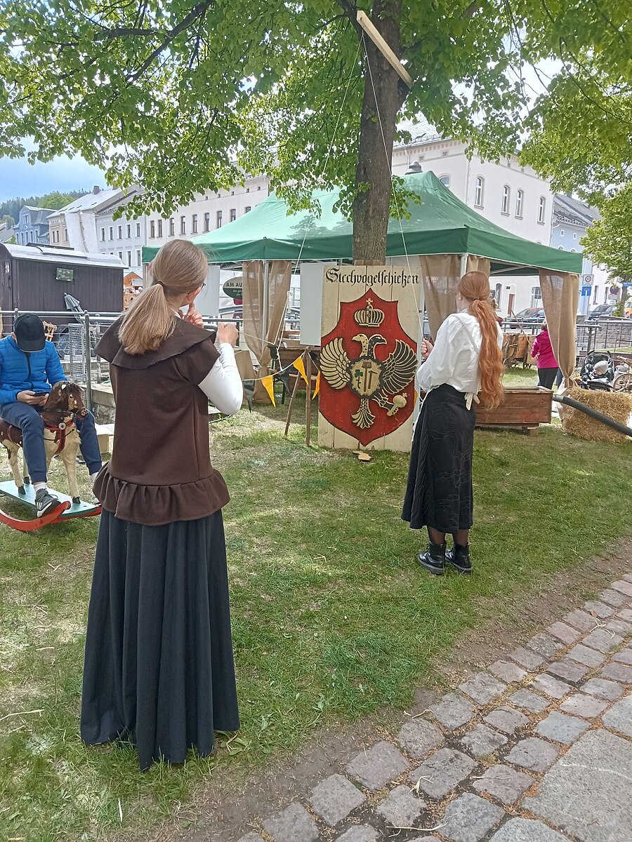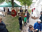 1 - Unseren ersten Marktstand schlugen wir bereits im Frühjahr zum historischen Markt auf. Beim Aufräumen hatten wir auf dem Boden einen alten Stechvogel aus Clara Angermanns Zeiten gefunden und das Internet verriet uns, dass er früher einmal Teil eines alten Jahrmarktspiels war. Es war nicht ganz einfach für die UNESCO-Kids, den Rest des Spiels nachzubauen, denn wir hatten nur ein altes Bild und eine ungenaue Beschreibung zur Verfügung. Trotzdem, pünktlich zum Markt war das Ding wieder voll einsatzfähig und das Herzstück unseres Standes. Aber auch andere Spiele aus alten Zeiten konnten ausprobiert werden und man bekam eine vage Vorstellung, wie damals die Kinder ohne Minecraft den Tag überlebt haben könnten. Schade, dass der zweite Tag so verregnet war.