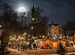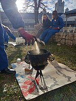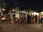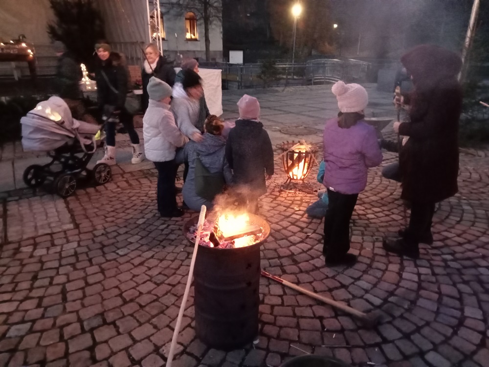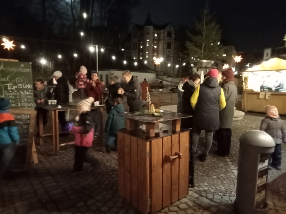 4 - Und, aller guten Dinge sind drei, war da noch das Türchen Nummer 4 des lebendigen Adventskalenders, diesmal zusammen mit der Clara-Angermann-Grundschule. Wir wollten natürlich im Clara-Angermann-Jahr einen würdigen Abschluss hinlegen. Deshalb hatten wir gleich den ganzen Markt gepachtet und noch ein paar Marktbuden obendrein. Danke an den Bauhof, der für uns extra noch mal die halbe Unterstadt umgebaut hat. In den liebevoll gestalteten Buden konnte man bei unserer Imker-AG selbst hergestellte Produkte kaufen. An der Lehrerbude gab es heiße Getränke und für die Verpflegung mit Crepes sorgte unsere unglaubliche Schülerfirma. Und wer kein Geld hatte, konnte sich an den Lagerfeuern ein leckeres Stockbrot backen, vorausgesetzt, man verpasste nicht den Moment, wo das Gebäck den Punkt der Brennbarkeit erreichte. Danke den Förstern, die geduldig das Feuer hüteten.