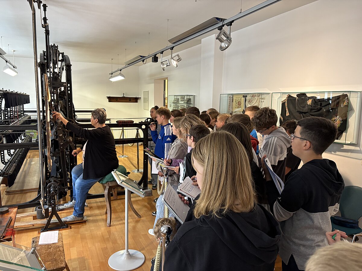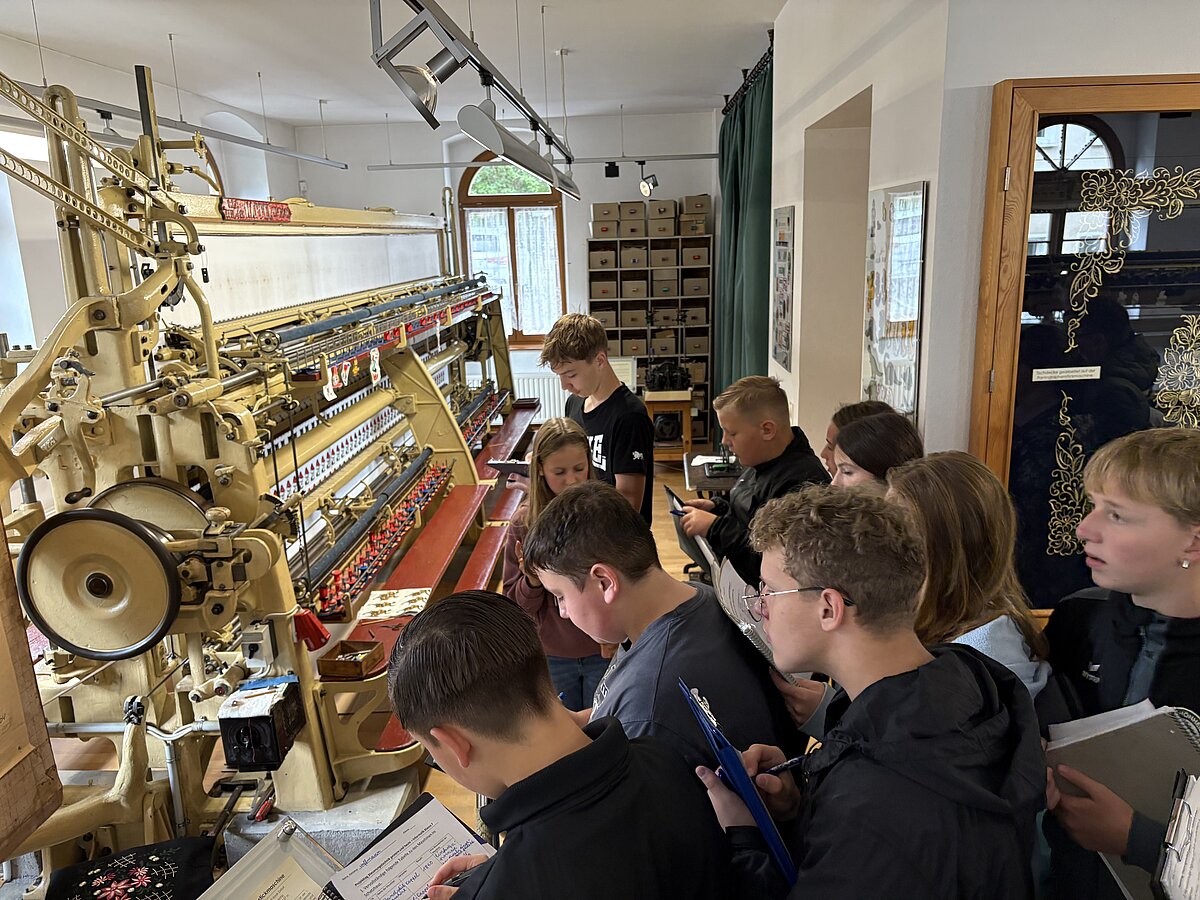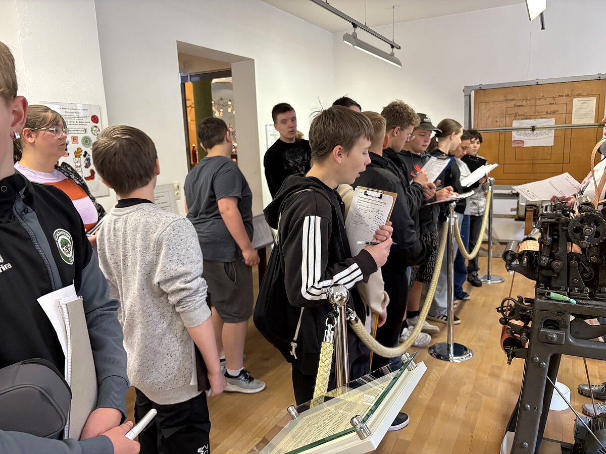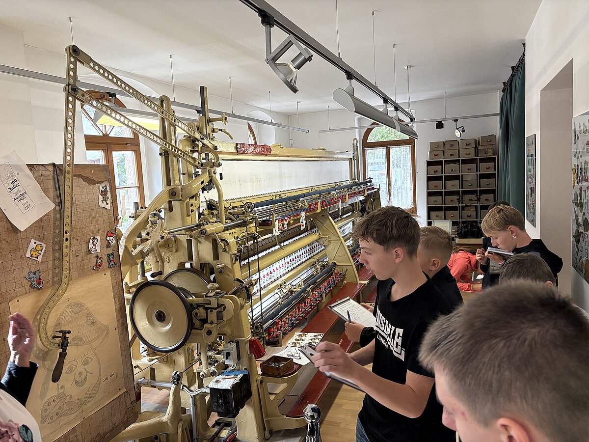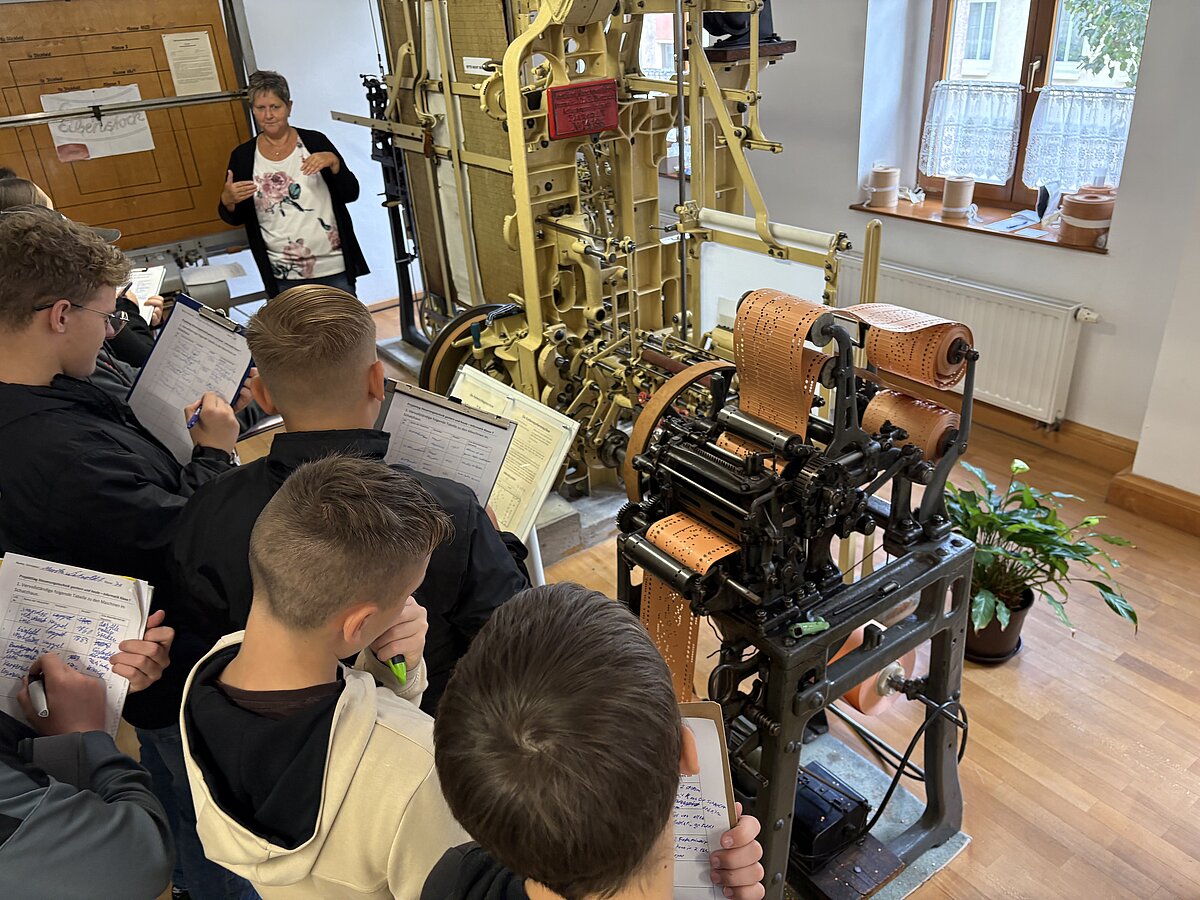Eibenstock - Am Vormittag des 16.09.2025 war es wieder so weit: zum zweiten Mal fand der Projekttag Informatik im Schatzhaus Eibenstock für unsere Klassen 7 statt. Wer vermutet schon in einem Museum, welches sich vorrangig mit der regionalen Geschichte und Stickerei beschäftigt, Lochkartenstanzer, Lochkartenkopierer und richtig große Maschinen. Die historischen Maschinen sind alle funktionstüchtig und werden vom sehr freundlichen Museumspersonal gern vorgeführt. Selbstverständlich auch die Steuerung über die Lochkarten. Hier können unsere Schülerinnen und Schüler einmal das EVA-Prinzip fernab der Rechentechnik erleben und erfahren.