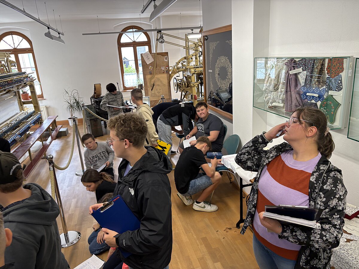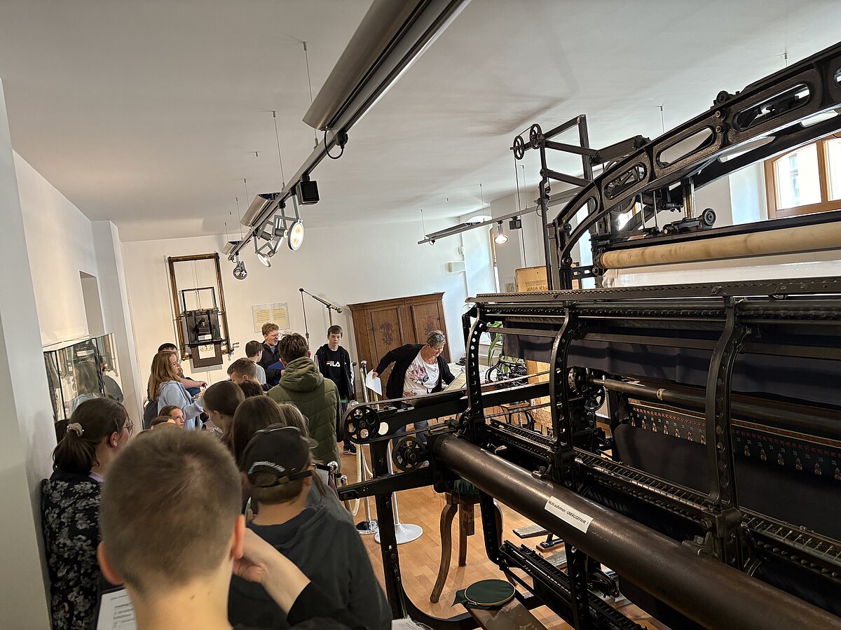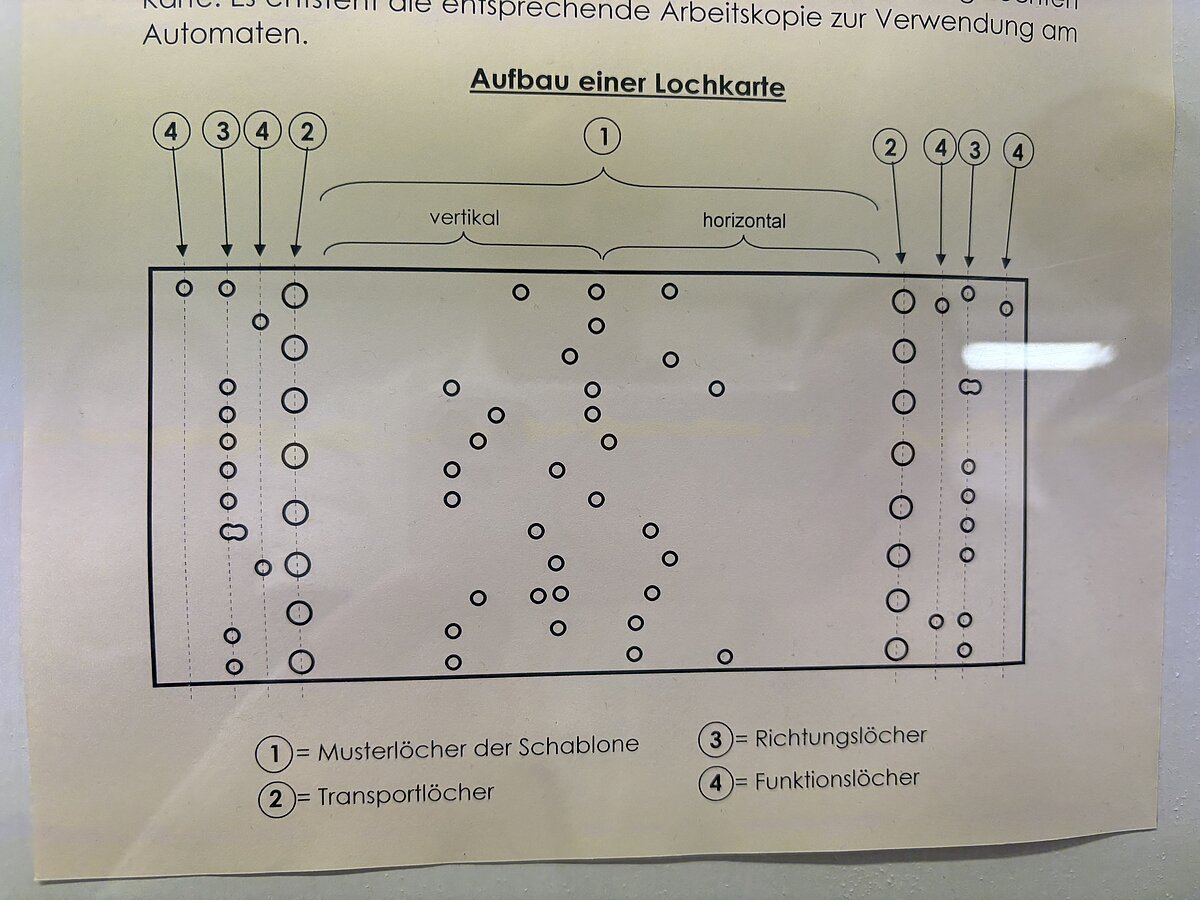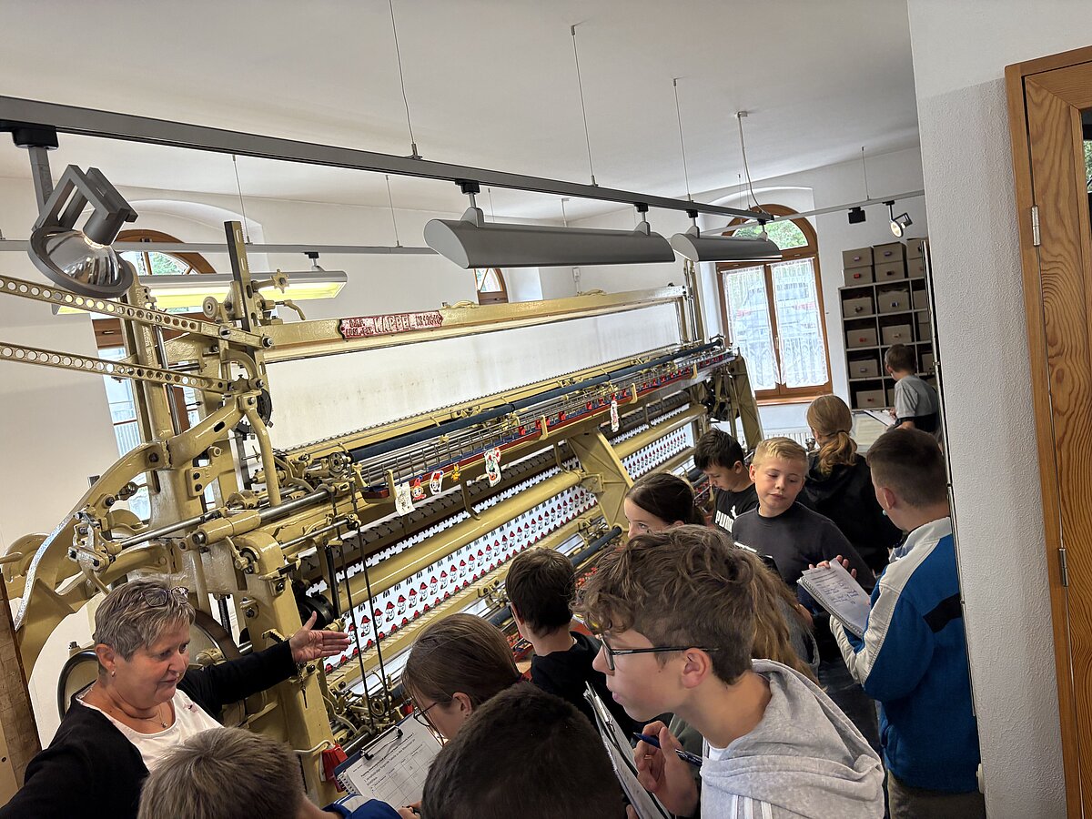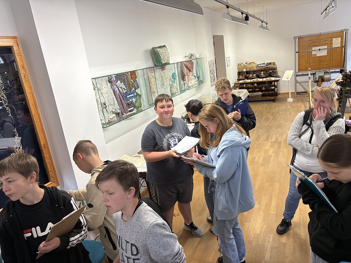 Eibenstock - Am Vormittag des 16.09.2025 war es wieder so weit: zum zweiten Mal fand der Projekttag Informatik im Schatzhaus Eibenstock für unsere Klassen 7 statt. Wer vermutet schon in einem Museum, welches sich vorrangig mit der regionalen Geschichte und Stickerei beschäftigt, Lochkartenstanzer, Lochkartenkopierer und richtig große Maschinen. Die historischen Maschinen sind alle funktionstüchtig und werden vom sehr freundlichen Museumspersonal gern vorgeführt. Selbstverständlich auch die Steuerung über die Lochkarten. Hier können unsere Schülerinnen und Schüler einmal das EVA-Prinzip fernab der Rechentechnik erleben und erfahren.