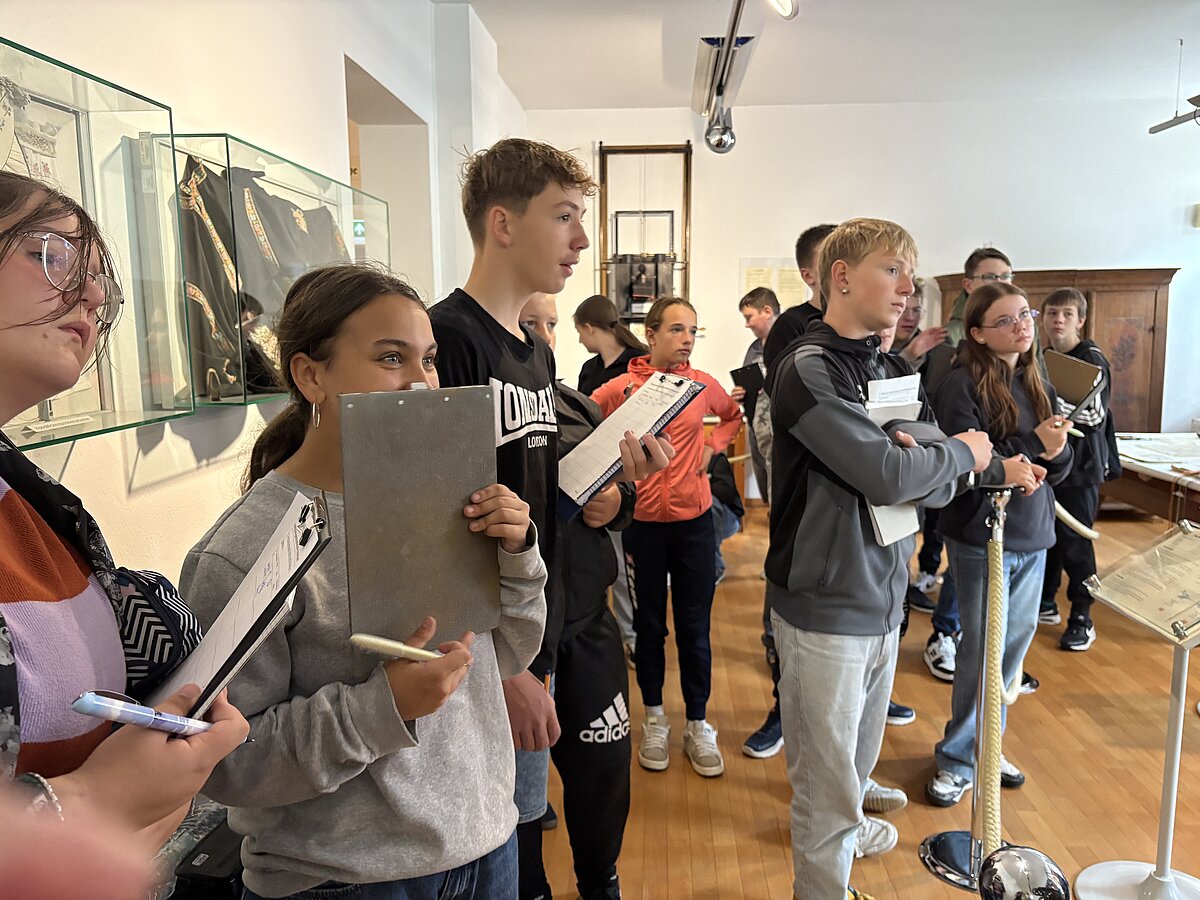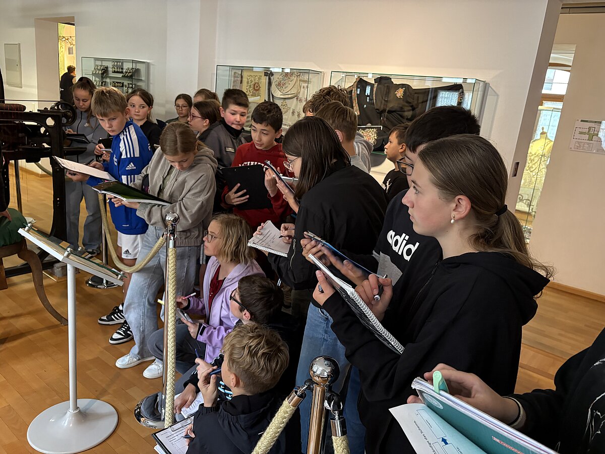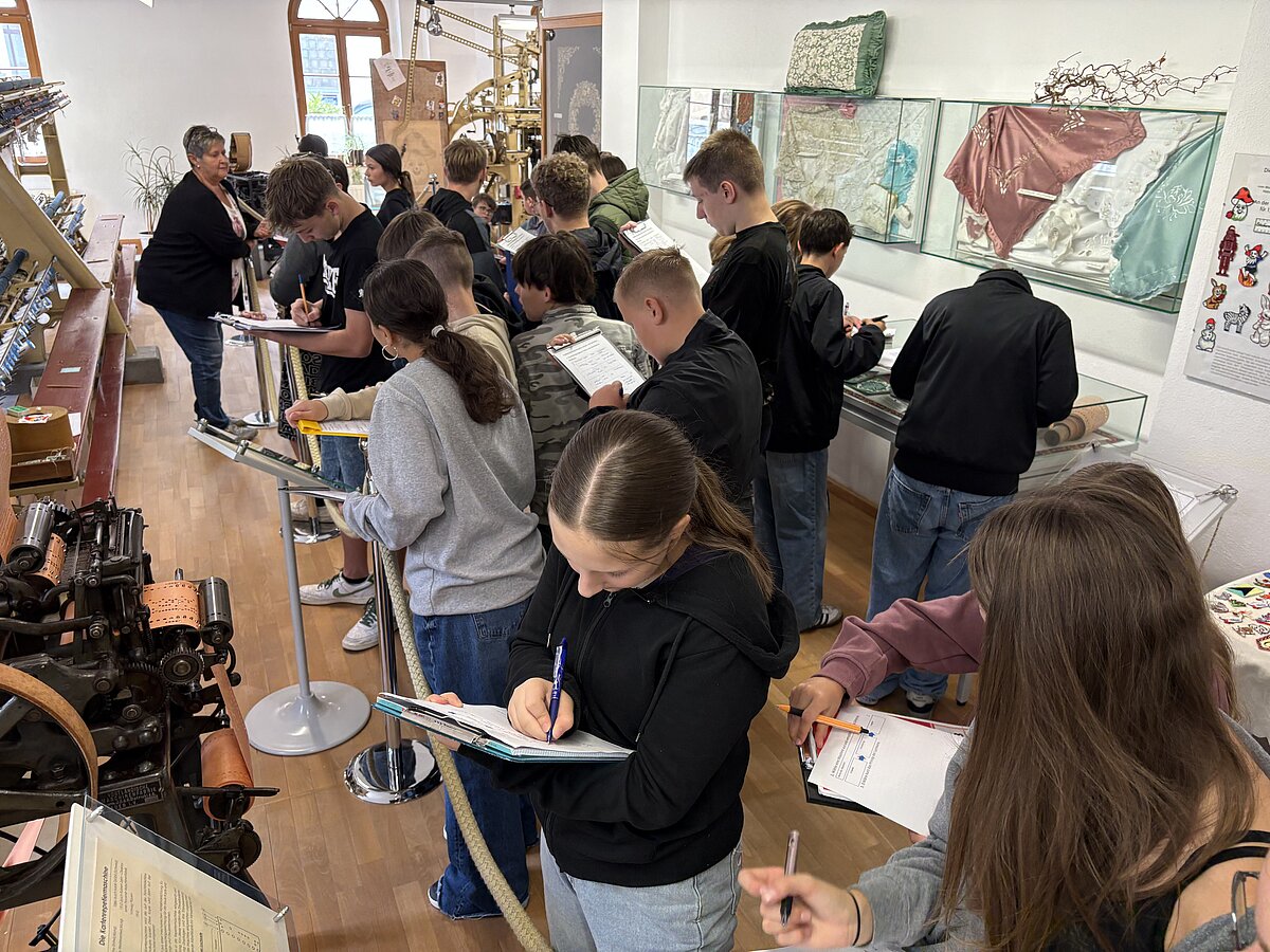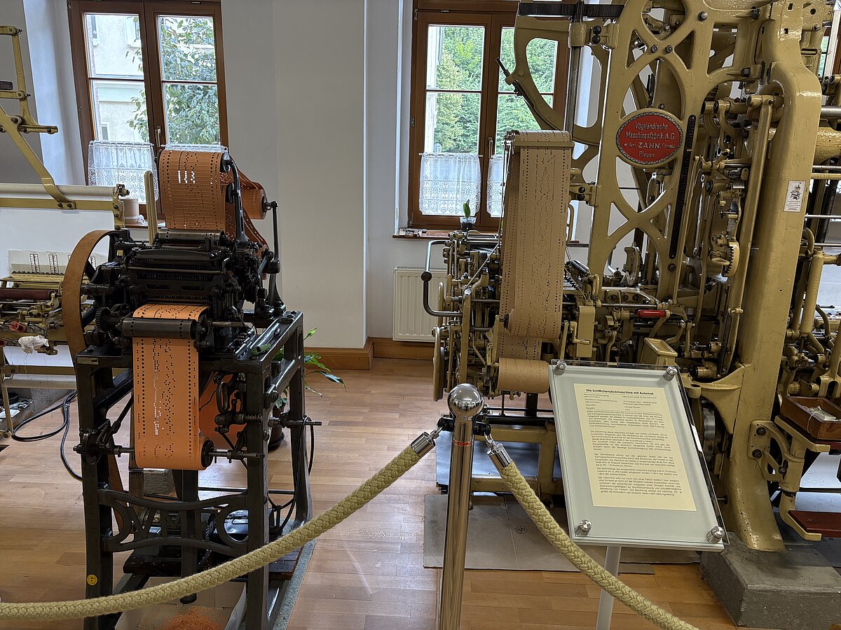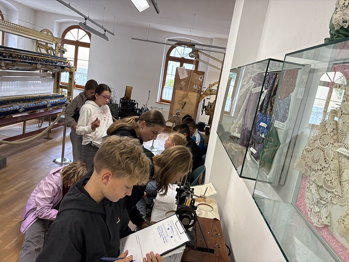 Eibenstock - Am Vormittag des 16.09.2025 war es wieder so weit: zum zweiten Mal fand der Projekttag Informatik im Schatzhaus Eibenstock für unsere Klassen 7 statt. Wer vermutet schon in einem Museum, welches sich vorrangig mit der regionalen Geschichte und Stickerei beschäftigt, Lochkartenstanzer, Lochkartenkopierer und richtig große Maschinen. Die historischen Maschinen sind alle funktionstüchtig und werden vom sehr freundlichen Museumspersonal gern vorgeführt. Selbstverständlich auch die Steuerung über die Lochkarten. Hier können unsere Schülerinnen und Schüler einmal das EVA-Prinzip fernab der Rechentechnik erleben und erfahren.