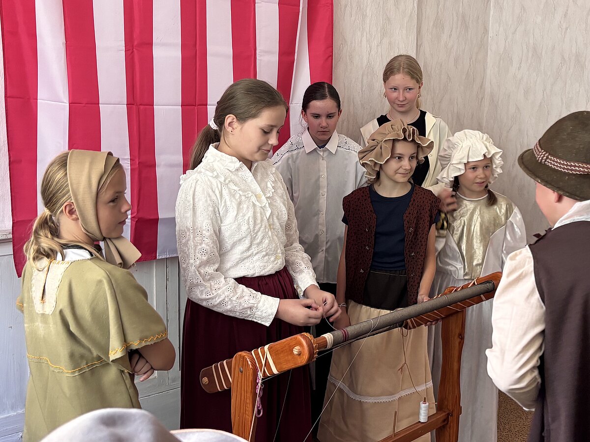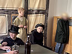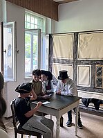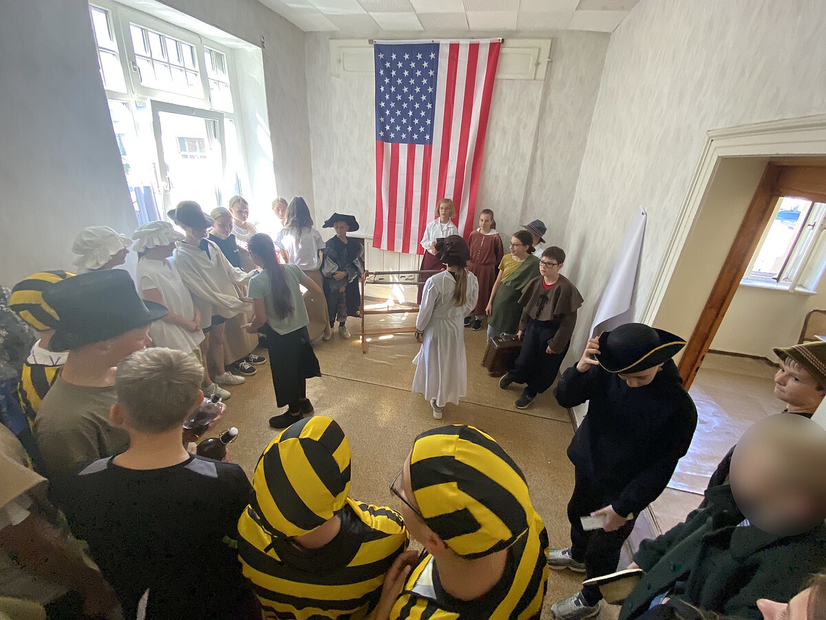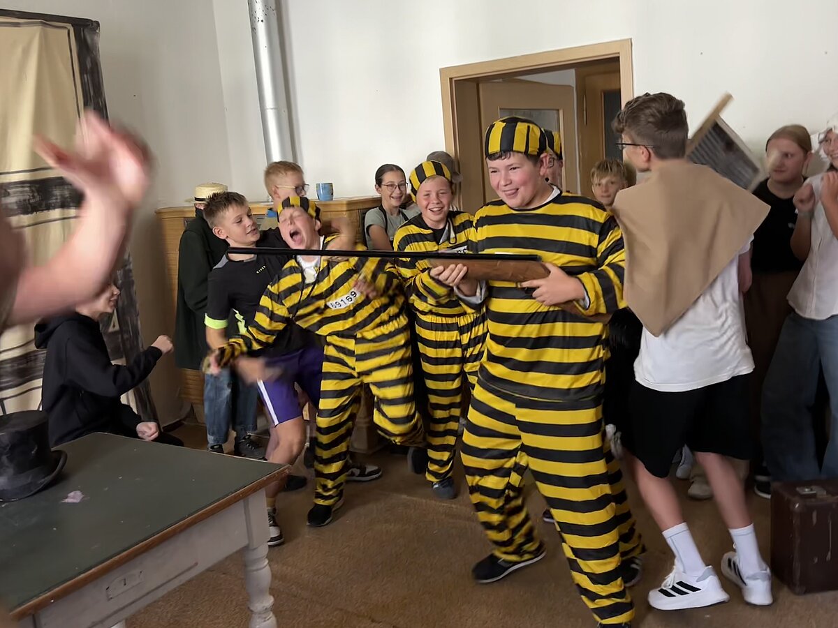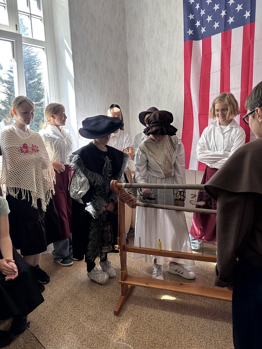 Ein besonderer Ort war das alte Konsulat, denn das seit Langem leerstehende Haus ist normalerweise nicht zugänglich. Unter den alten Stuckdecken ließ sich mit selbst erdachten Stehgreif-Theaterstücken natürlich wunderbar die Zeit aufleben lassen, als Clara Angermann nach Eibenstock kam und als Eibenstocker Stickereien den Wilden Westen eroberten. Hoffentlich waren wir nicht die Letzten, die dem verfallenen Gemäuer noch einmal Leben einhauchten. Frau Wollschläger und Frau Seidel hatten alle Hände voll zu tun, damit bei der Rollenverteilung und der Schlacht um die besten Kostüme nicht tatsächlich der Wilde Westen ausbrach. Danke an die Mitarbeiter der Stadtverwaltung, die das möglich gemacht haben. Der Wilde Westen war auch noch einmal Thema im Kulturzentrum. Der Line-Dance, den uns Schülerinnen der Klasse 9a mit viel Geduld beigebracht haben, war ein typischer Tanz europäischer Auswanderer. Sicher trugen dabei nicht wenige Ladies an ihren Kleidern Eibenstocker Stickereien. Danke, dass wir in den Spiegelsaal durften, das gab dem Ganzen ein tolles Ambiente.