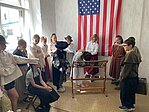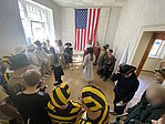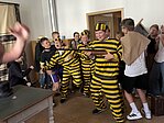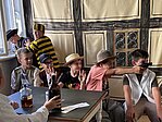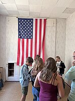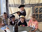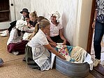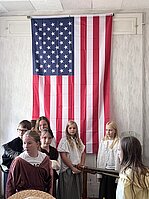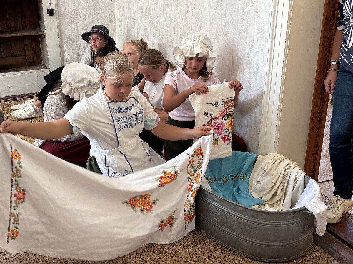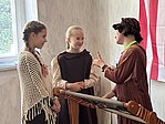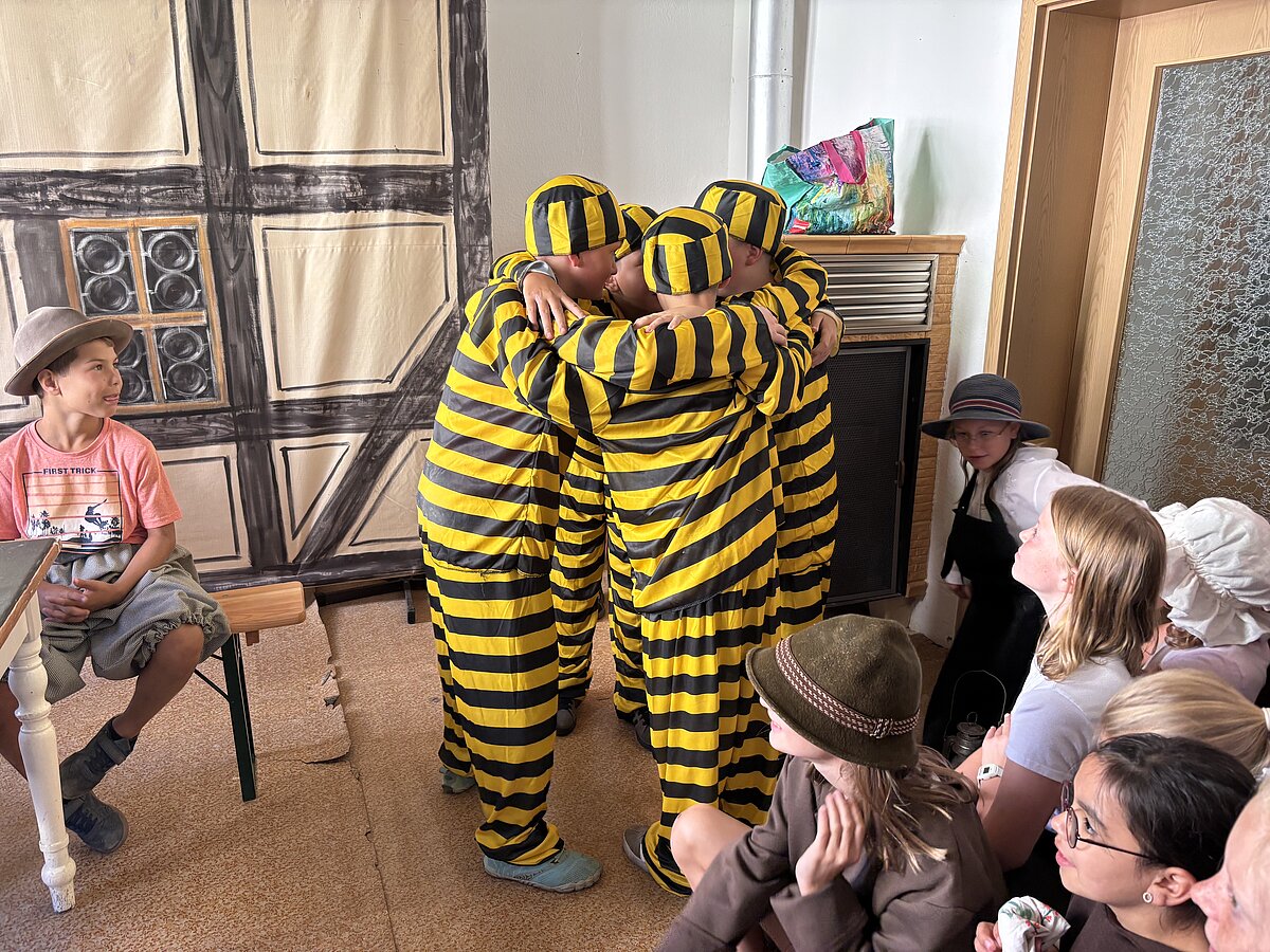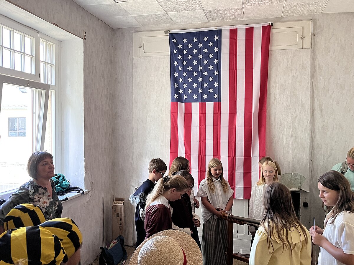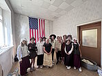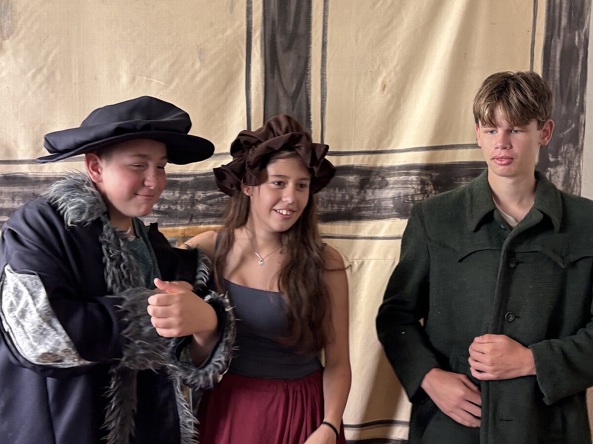Ein besonderer Ort war das alte Konsulat, denn das seit Langem leerstehende Haus ist normalerweise nicht zugänglich. Unter den alten Stuckdecken ließ sich mit selbst erdachten Stehgreif-Theaterstücken natürlich wunderbar die Zeit aufleben lassen, als Clara Angermann nach Eibenstock kam und als Eibenstocker Stickereien den Wilden Westen eroberten. Hoffentlich waren wir nicht die Letzten, die dem verfallenen Gemäuer noch einmal Leben einhauchten. Frau Wollschläger und Frau Seidel hatten alle Hände voll zu tun, damit bei der Rollenverteilung und der Schlacht um die besten Kostüme nicht tatsächlich der Wilde Westen ausbrach. Danke an die Mitarbeiter der Stadtverwaltung, die das möglich gemacht haben. Der Wilde Westen war auch noch einmal Thema im Kulturzentrum. Der Line-Dance, den uns Schülerinnen der Klasse 9a mit viel Geduld beigebracht haben, war ein typischer Tanz europäischer Auswanderer. Sicher trugen dabei nicht wenige Ladies an ihren Kleidern Eibenstocker Stickereien. Danke, dass wir in den Spiegelsaal durften, das gab dem Ganzen ein tolles Ambiente.