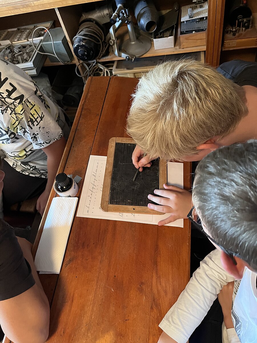 Natürlich konnte man auch in der Schule Dinge entdecken, die nur zu so einem Jubiläum möglich sind. So haben zum Beispiel die Schüler der Klasse 10a eine Bodenkammer zu einer richtigen Zeitkapsel umgebaut. Im Jahr 1925 hat Frau Krehfeld dort oben den Schülern die deutsche Schrift beigebracht, mit Tusche, Feder und Rohrstock. Frau Staab musste mit ihren fleißigen Helfern aus der Klasse 9 schon am Sonntag vorkochen, damit wir kosten konnten, was man damals gegessen hat, garantiert ohne Geschmacksverstärker. In der Physik ging es natürlich um die Dampfmaschine, die bedeutendste Erfindung des 18. Jahrhunderts.